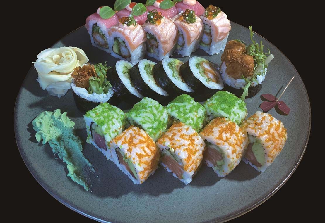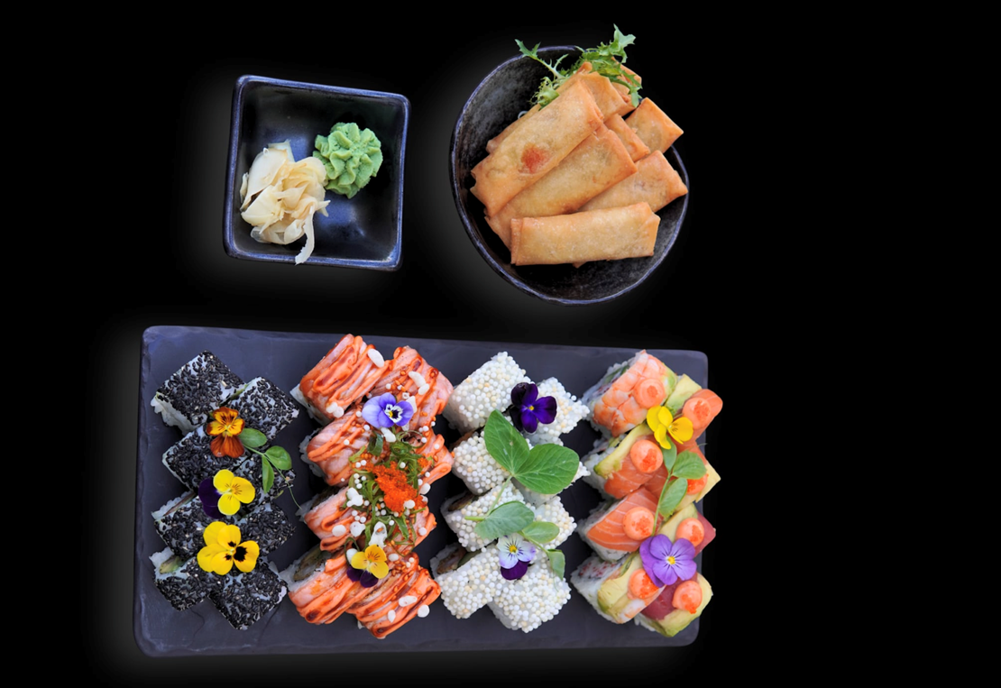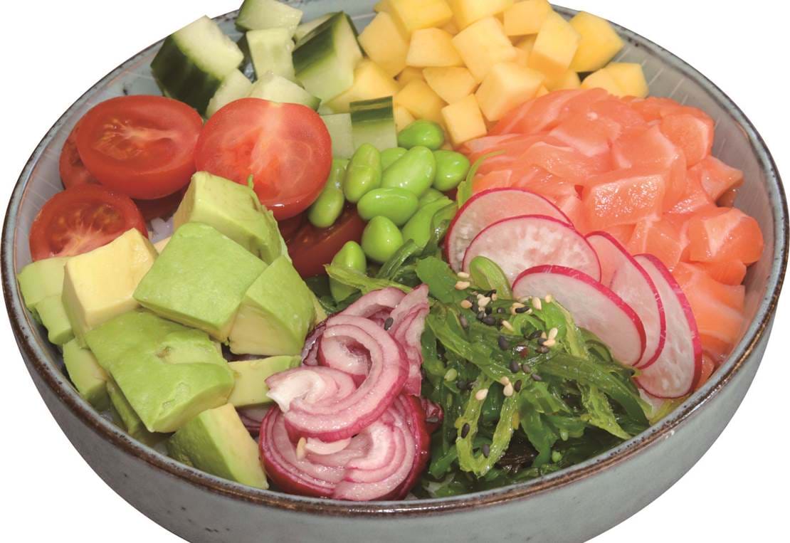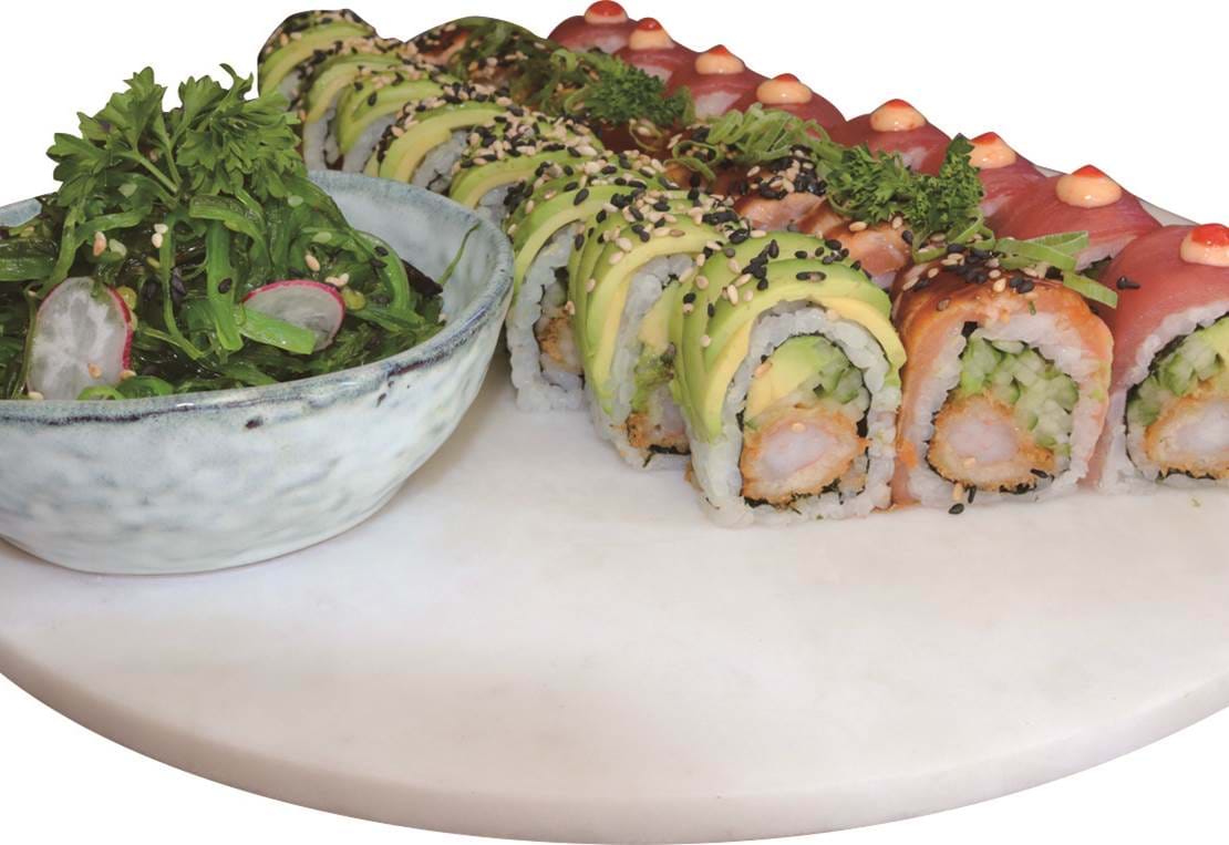 Ris, laks, agurk, avokado, tangsalat, edamame radiser, mango, ingefær og forårsløg.