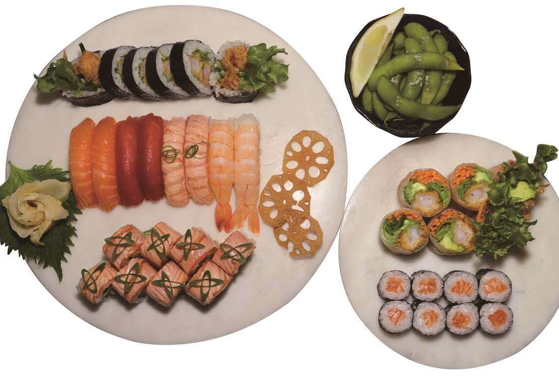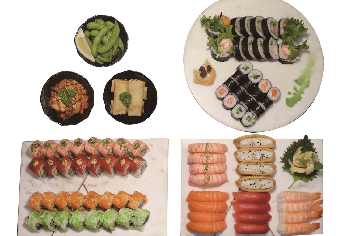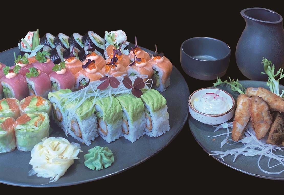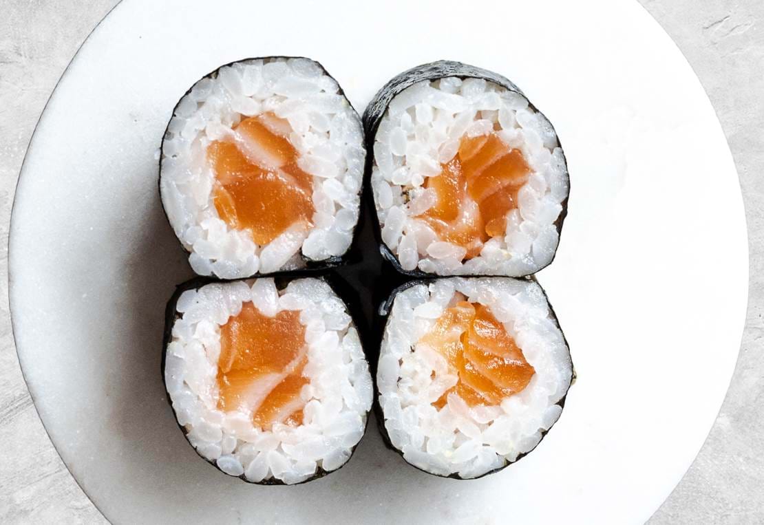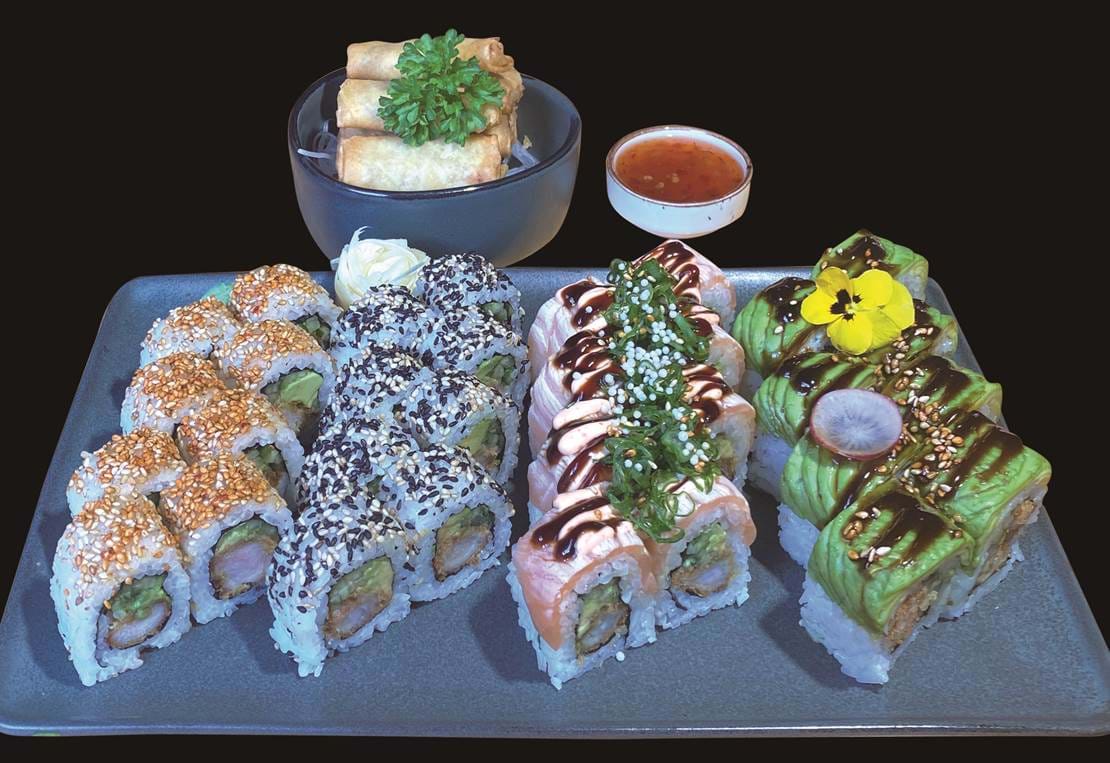 Ris, laks, agurk, avokado, tangsalat, edamame radiser, mango, ingefær og forårsløg.