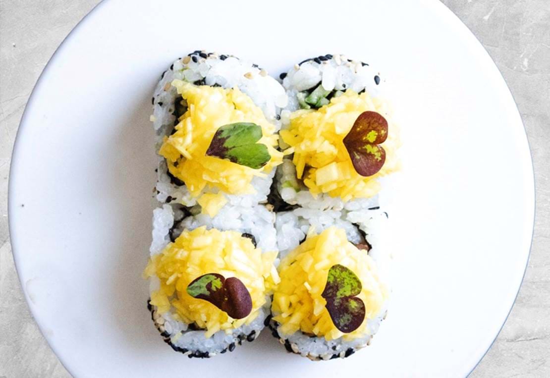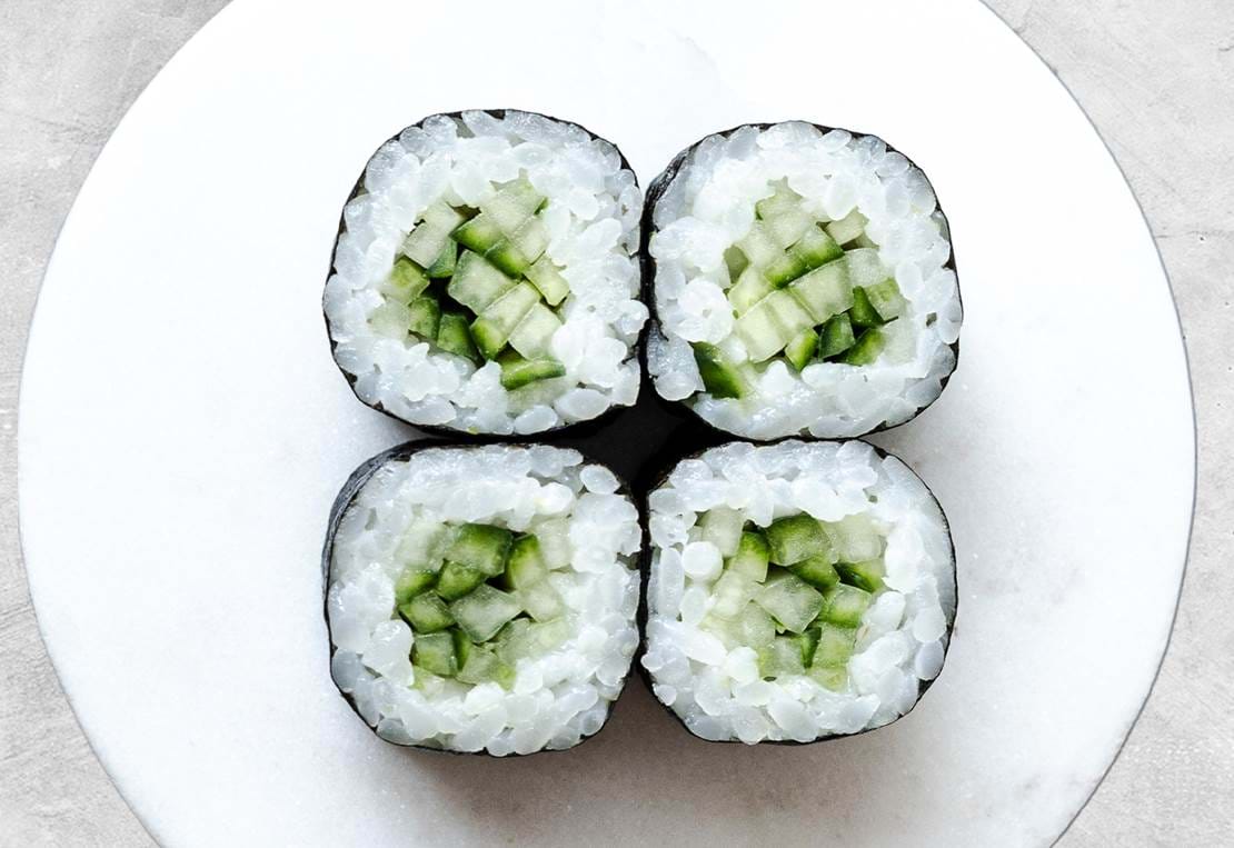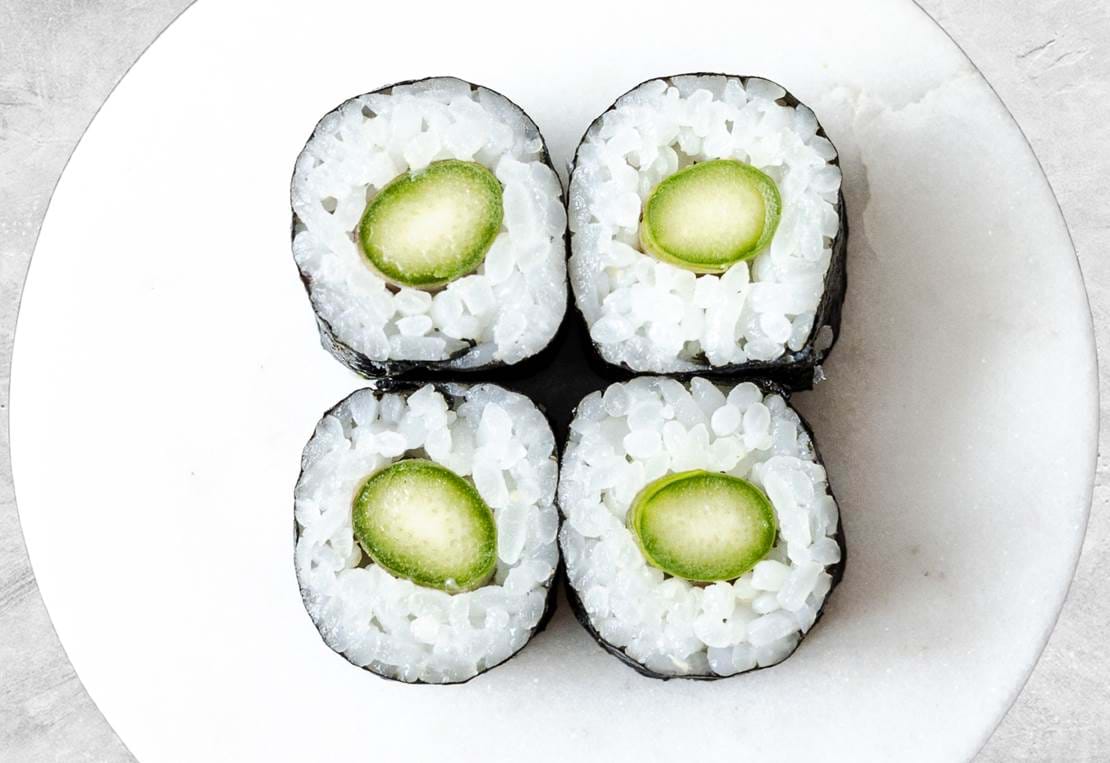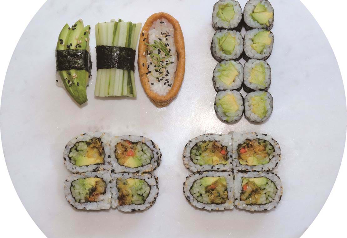 Ris, tun, agurk, avokado, tangsalat, edamame, radiser, mango, ingefær og forårsløg.
