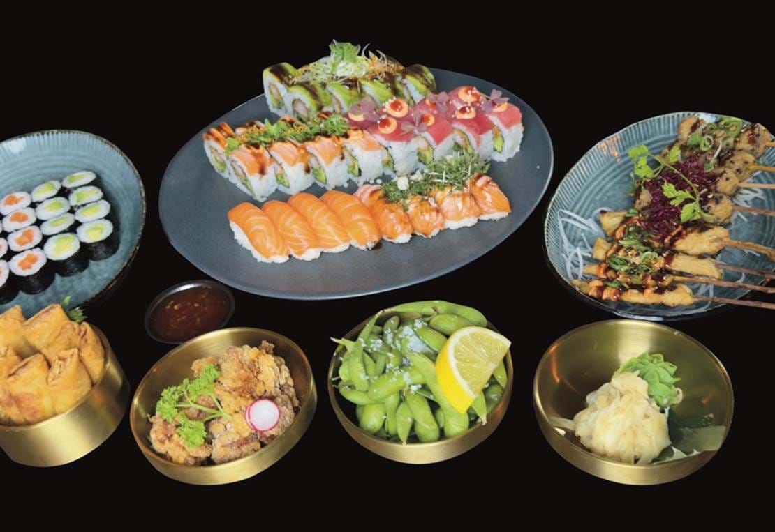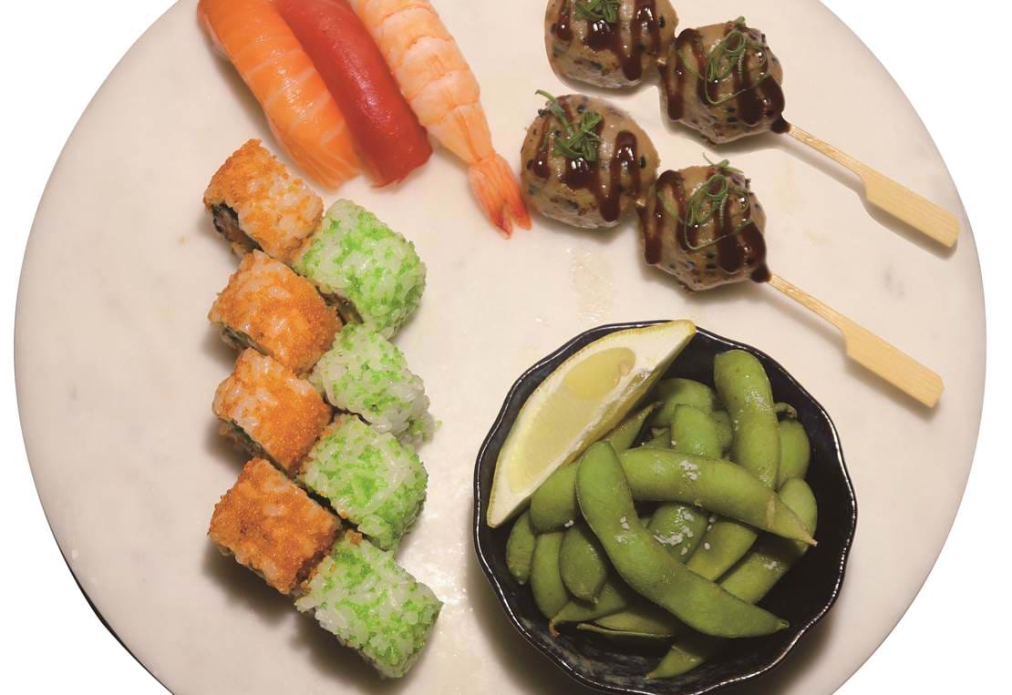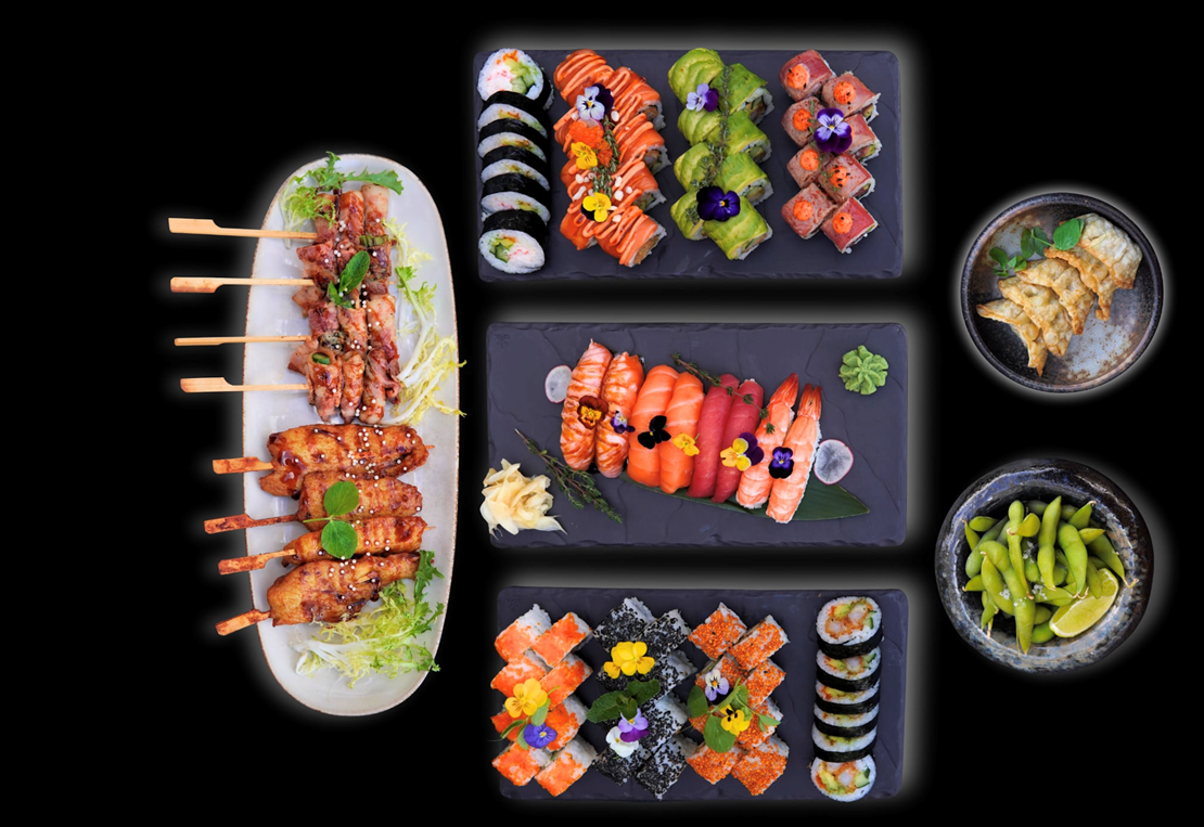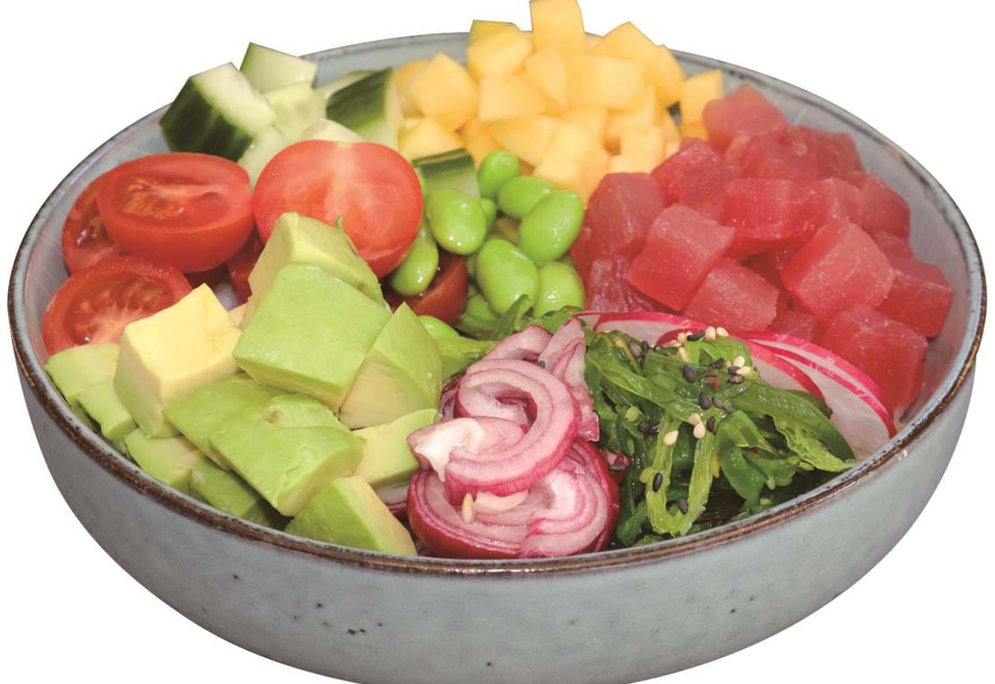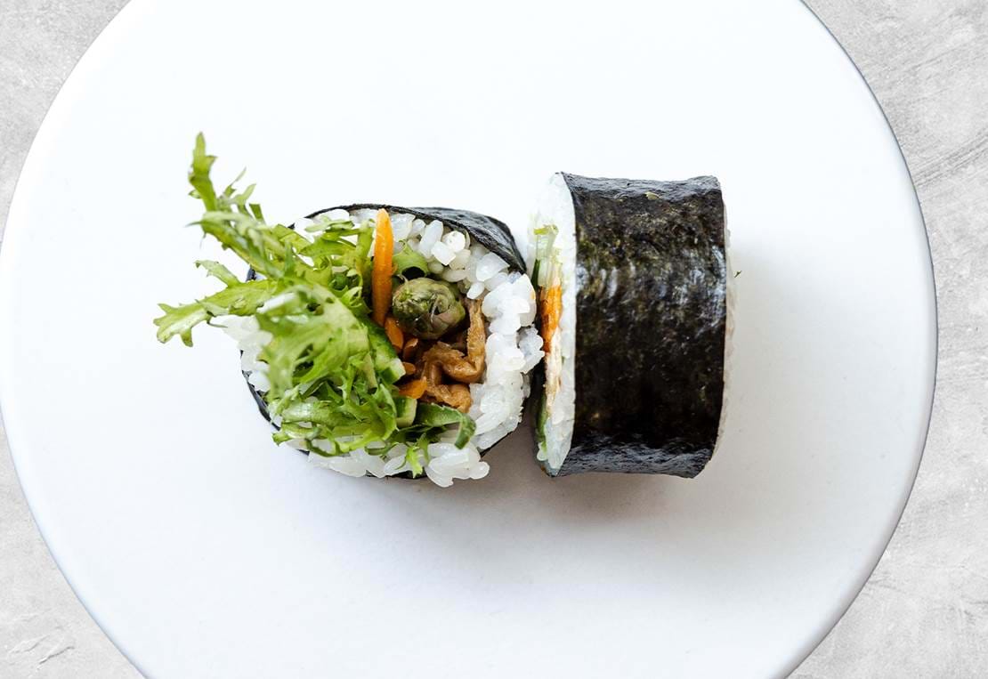 Ris, tun, agurk, avokado, tangsalat, edamame, radiser, mango, ingefær og forårsløg.