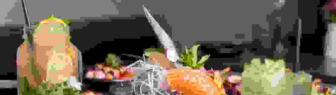 Laks, gulerødder, forårsløg, avokado og agurk.