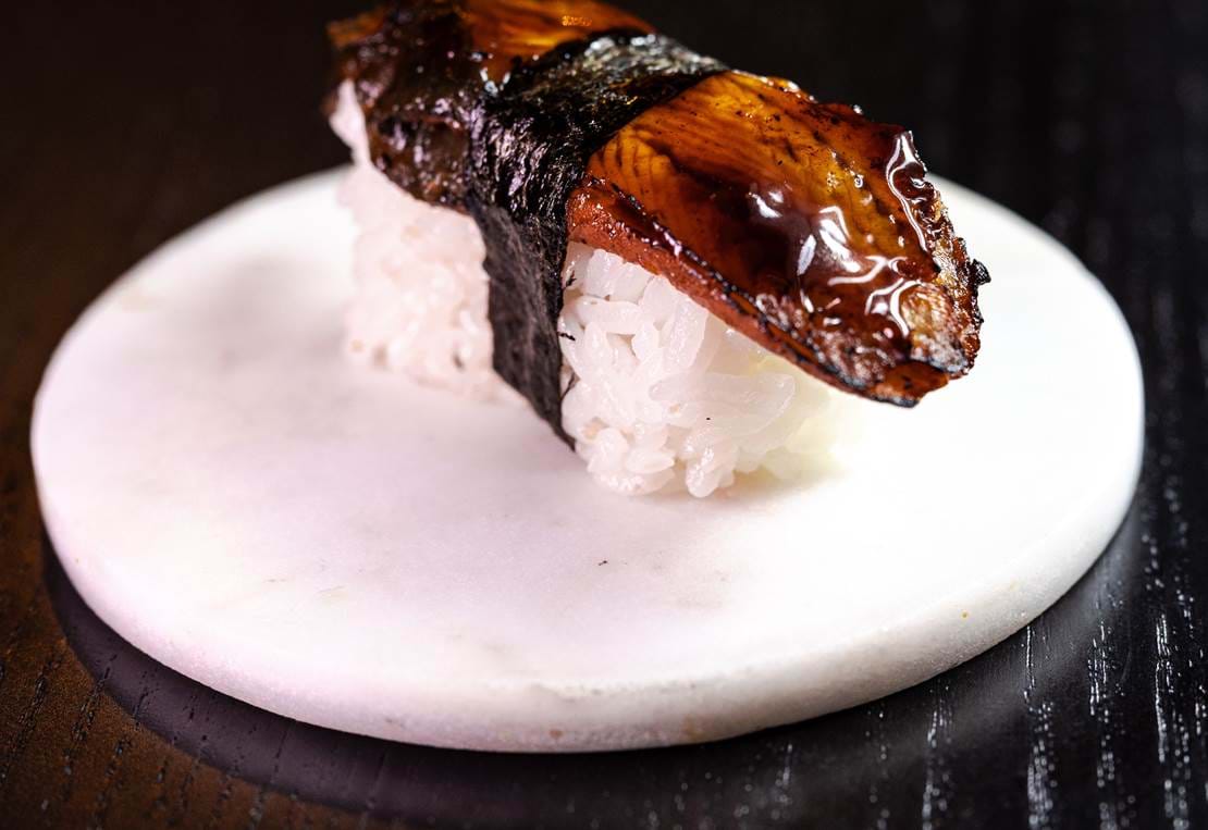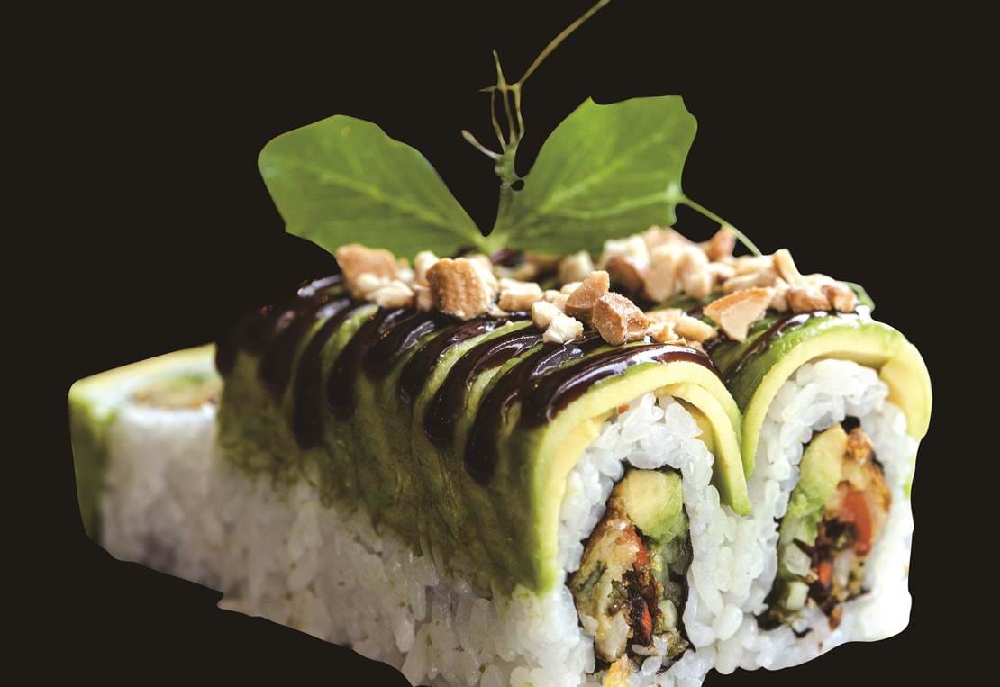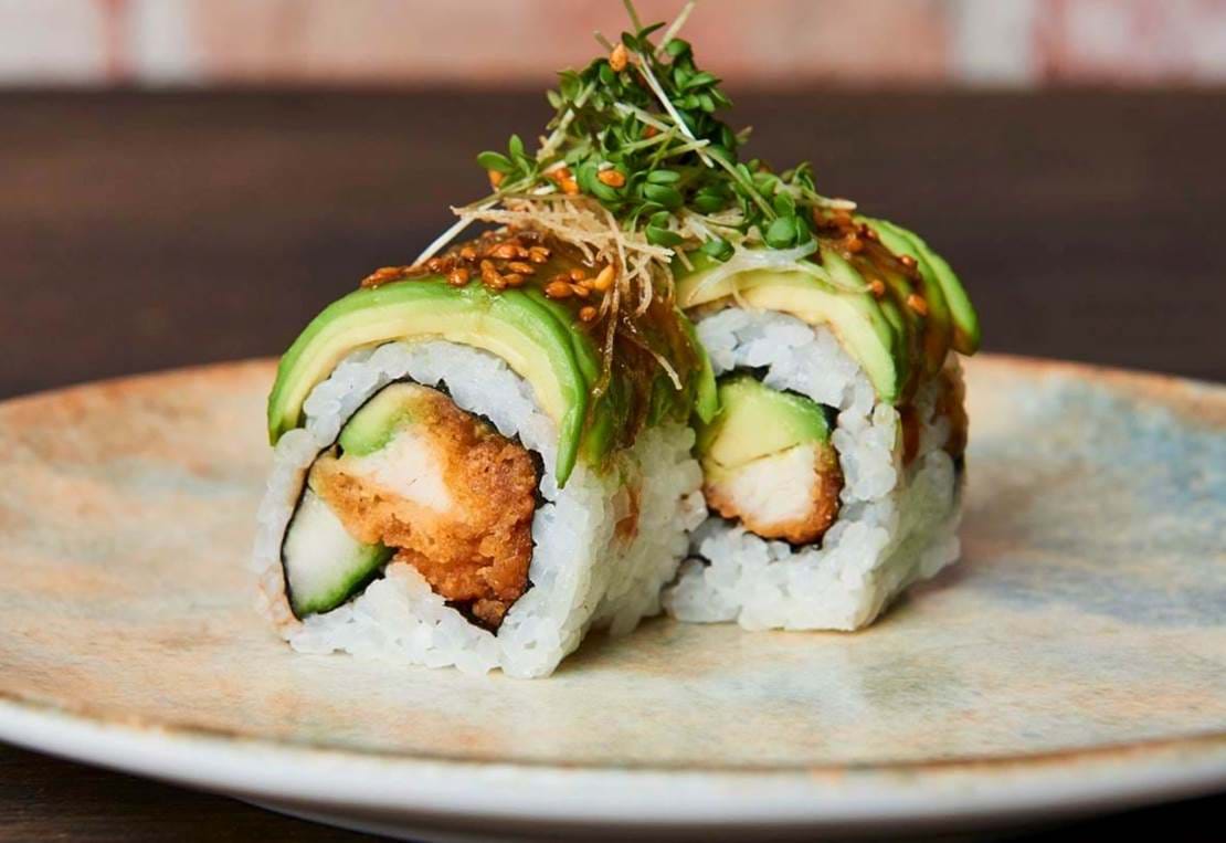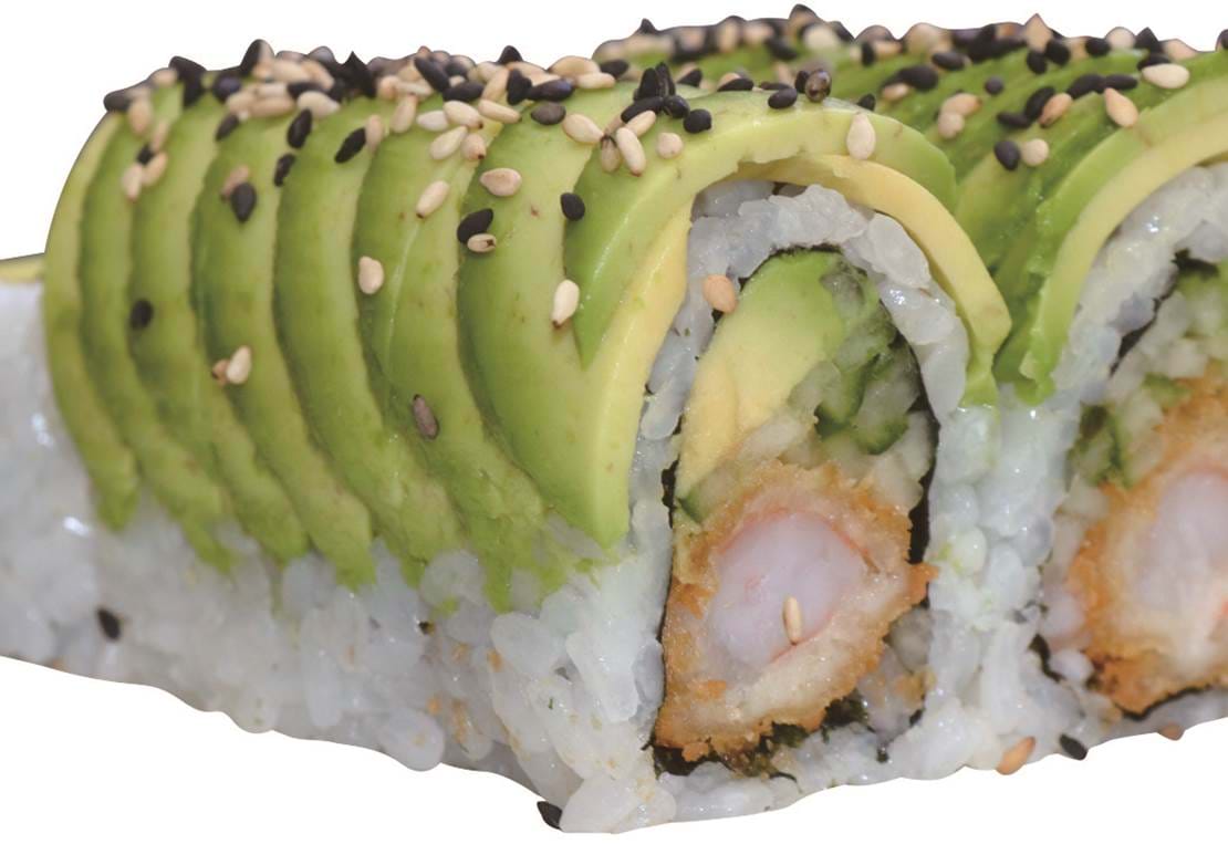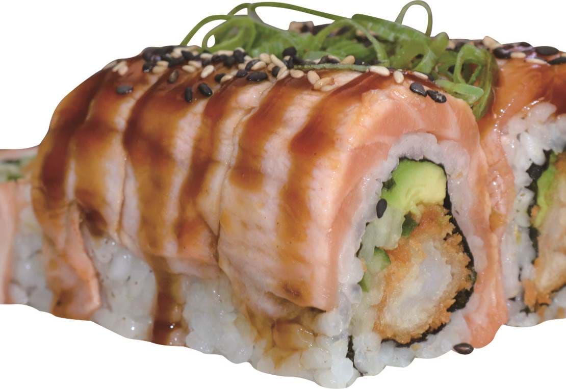 Crispy rejer, ål og agurk, toppet med avokado, sesam og teriyakisauce.