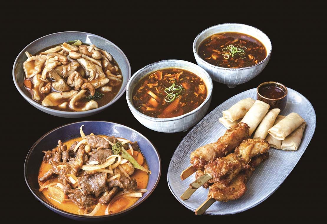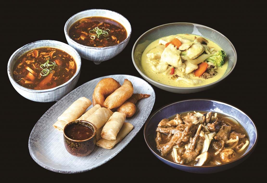 Forretter Peking suppe Mini forårsruller Kylling satay spyd Hovedretter Kylling med cashewnødder i stærk sauce Oksekød i rød karry Alle hovedretter serveres med ris.