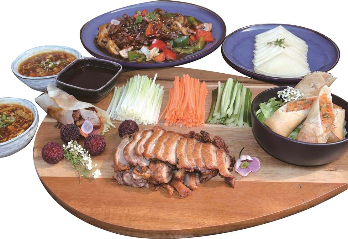 Forretter Peking suppe Forårsruller med and Hovedretter Peking and med pangekage, agurk, gulerødder, porre og hjemmelavet peking sauce. Oksekød med sort pebersauce og grøntsager. Alle hovedretter serveres med ris.