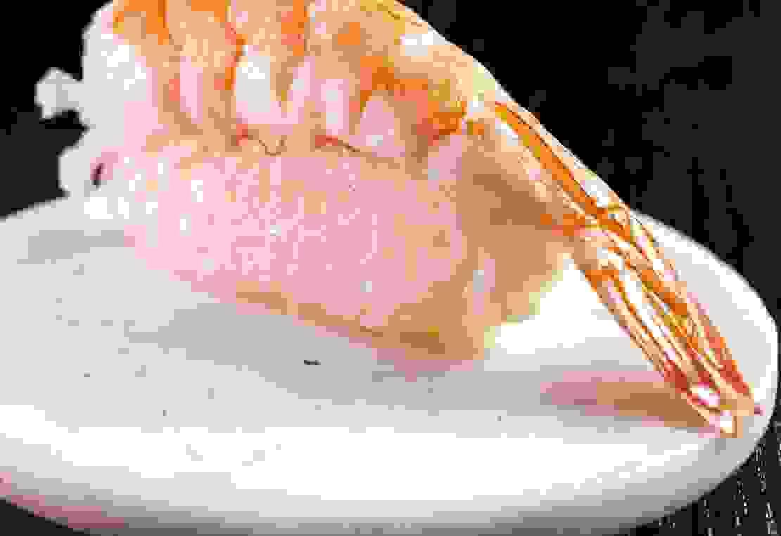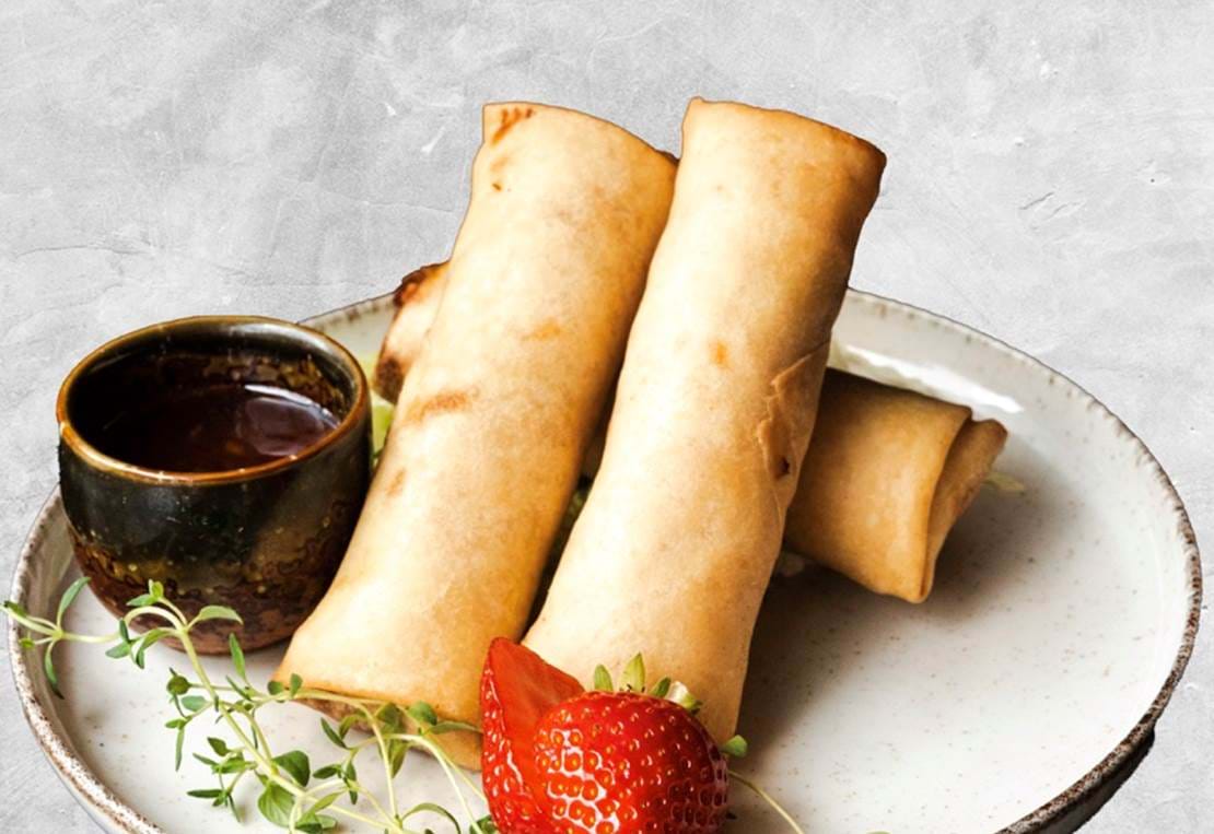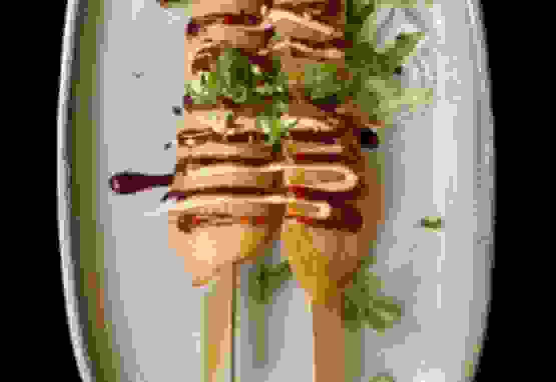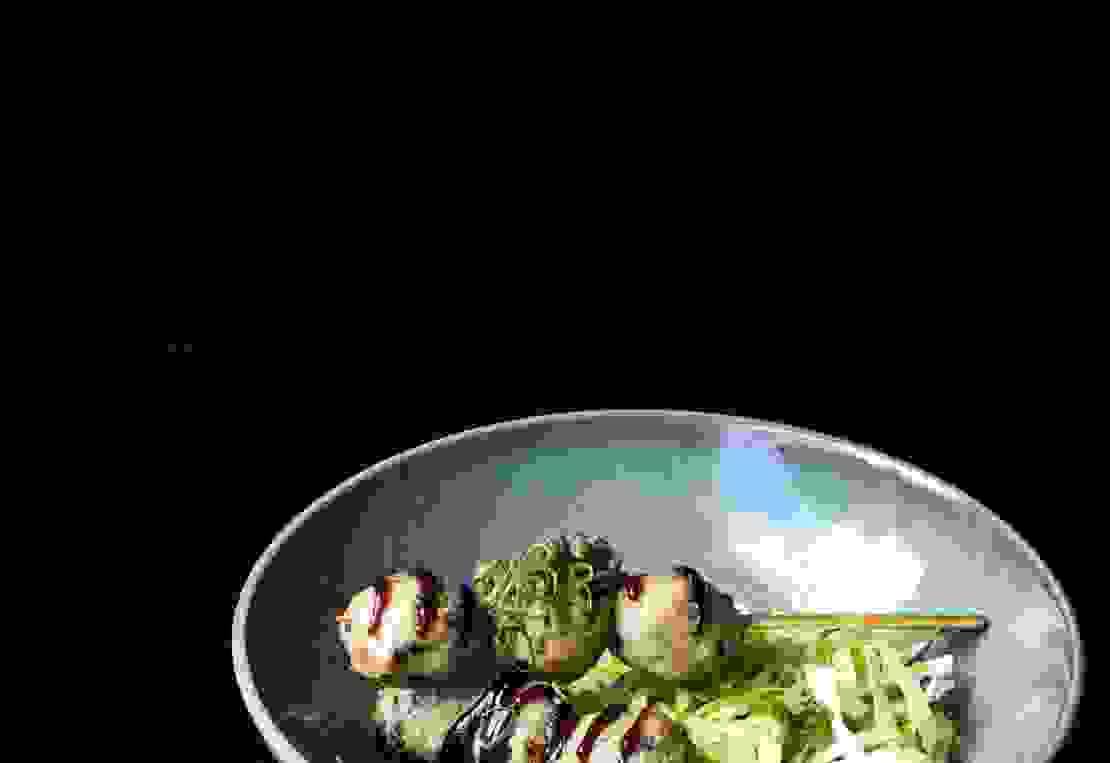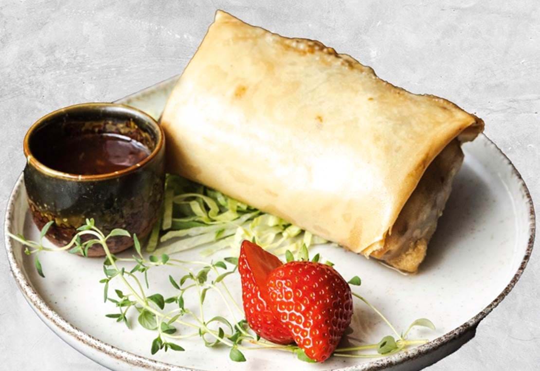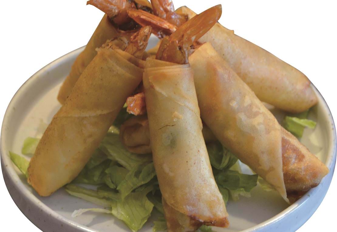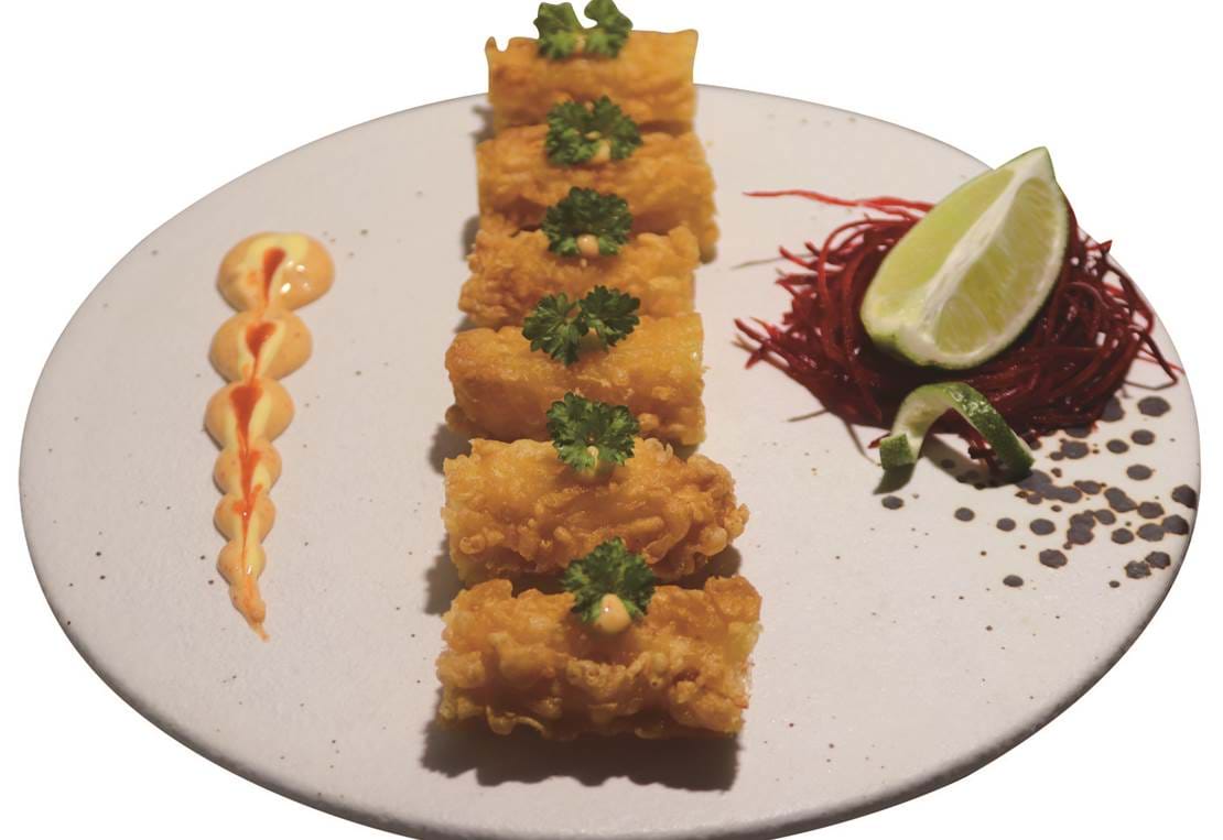 Crispy rejer, asparges, spicy sauce, rullet i masago.