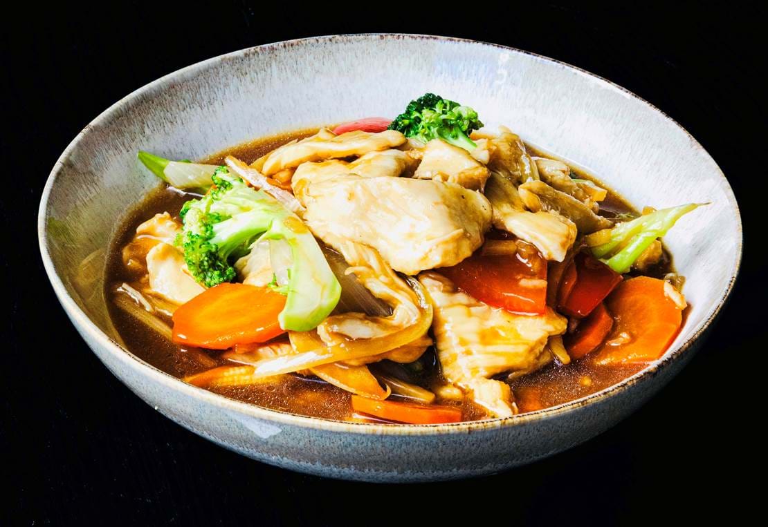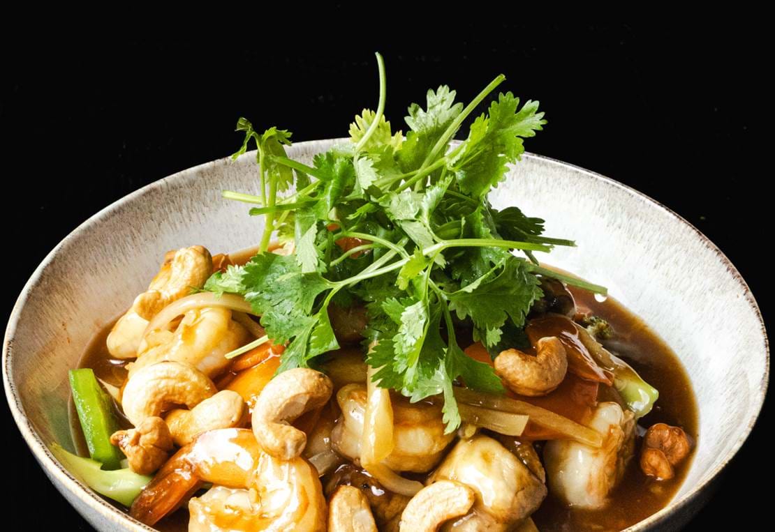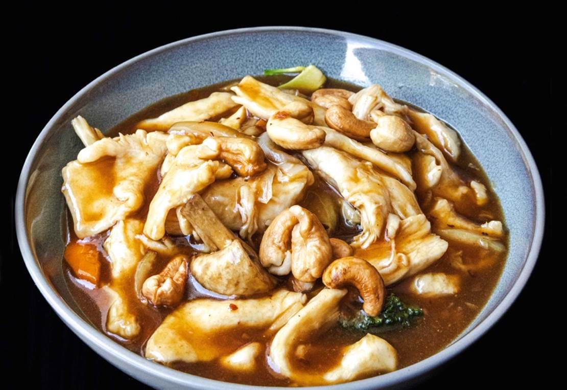 Thai østerssauce med blandet grøntsager, cashewnødder og valgfrit protein.