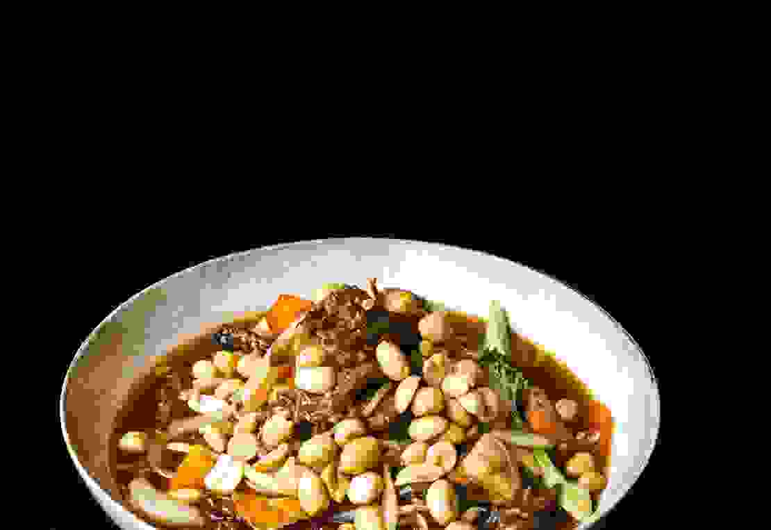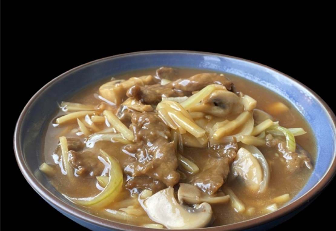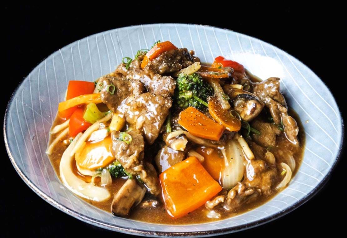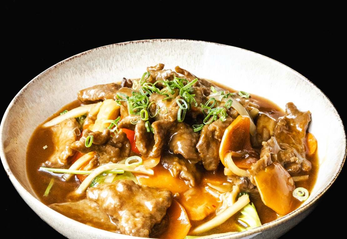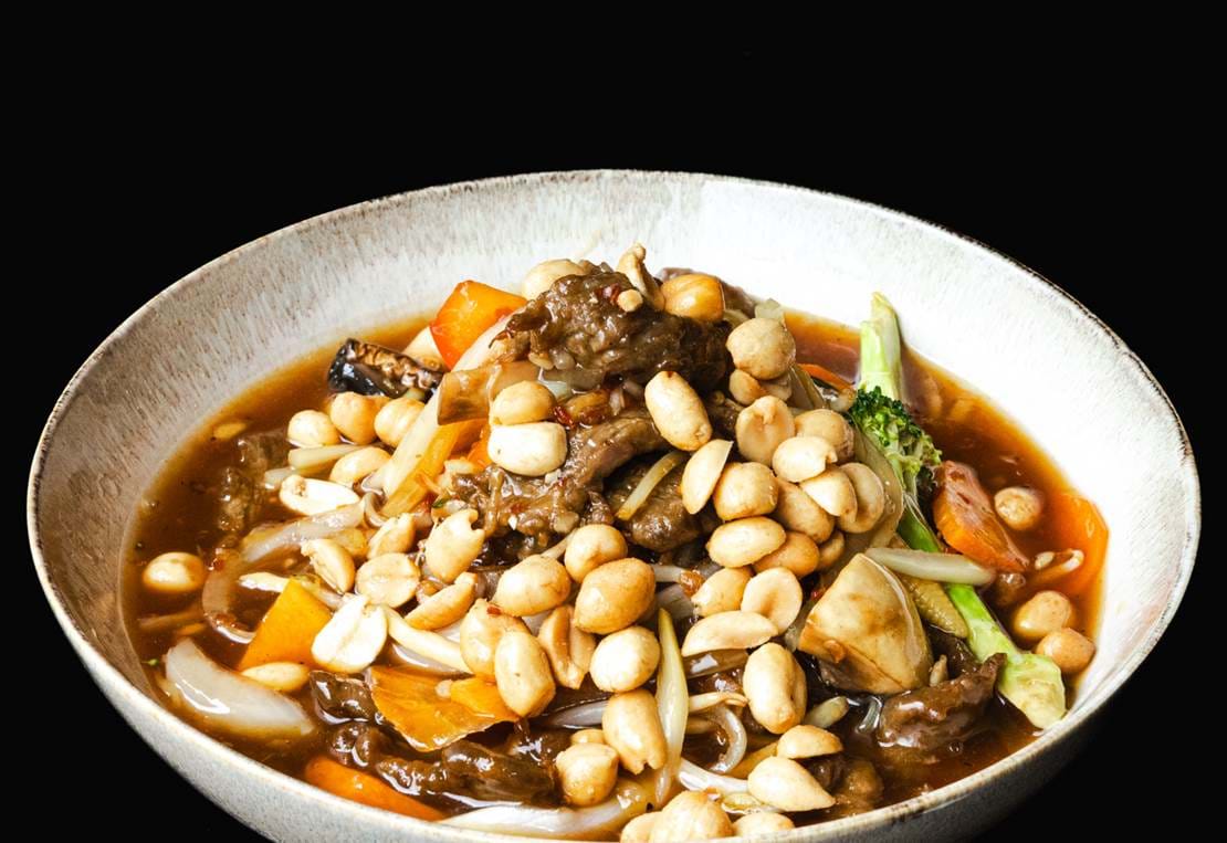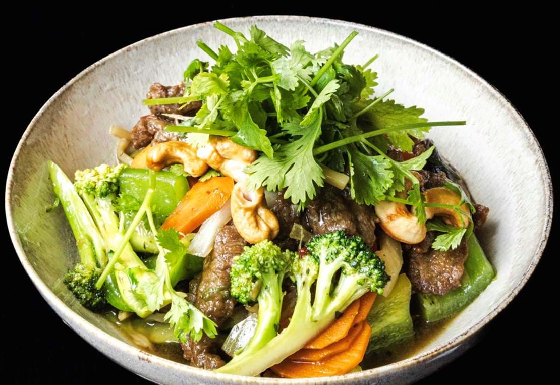 Oksekød med blandet grøntsager, cashewnnødder, rødløg, basilikum og koriander i hjemmelavet sauce.