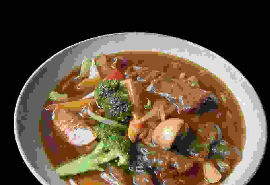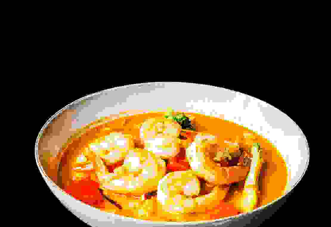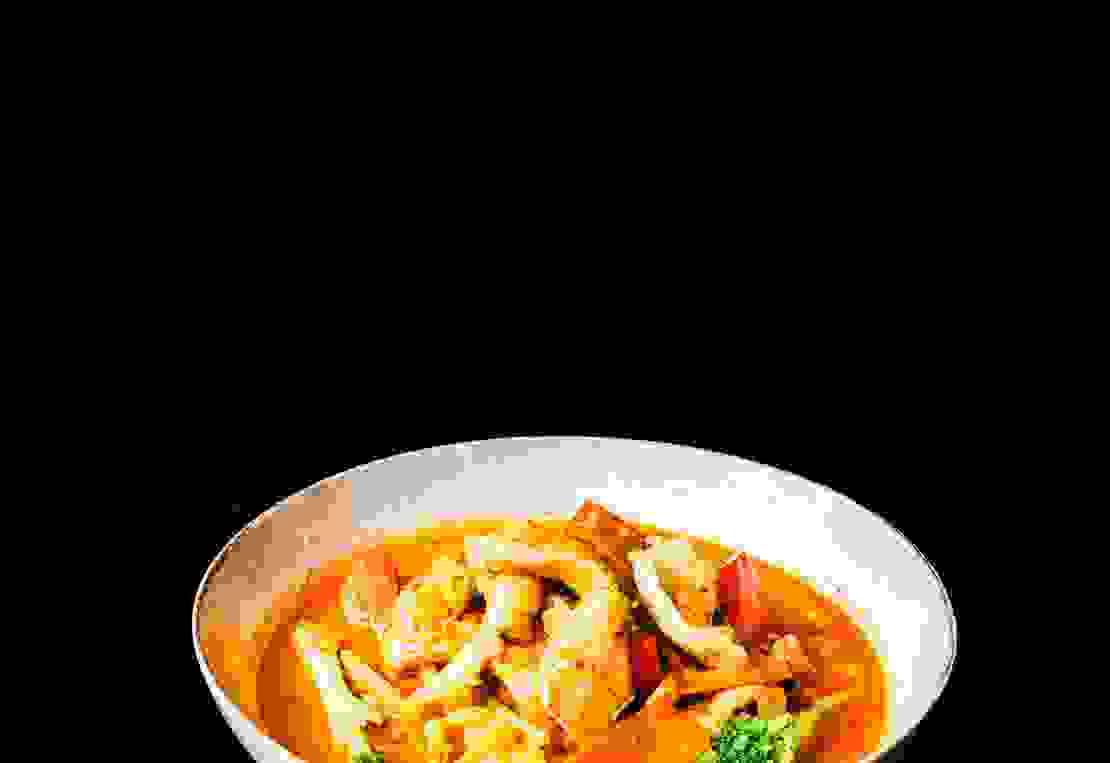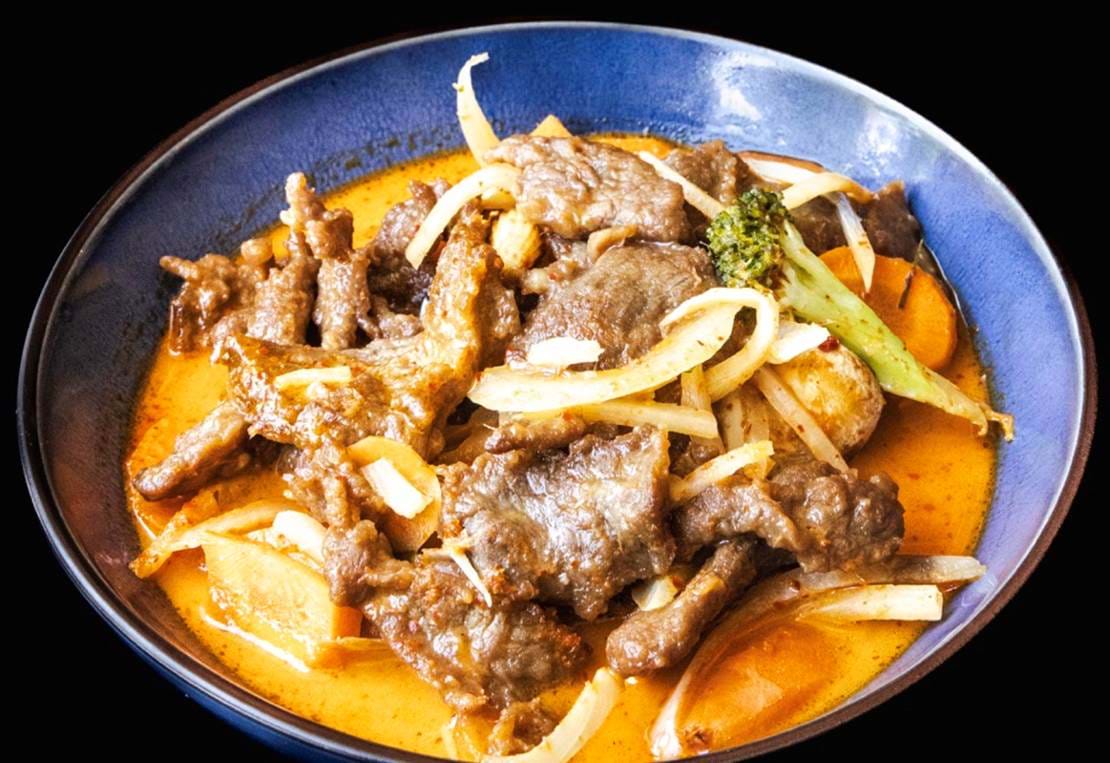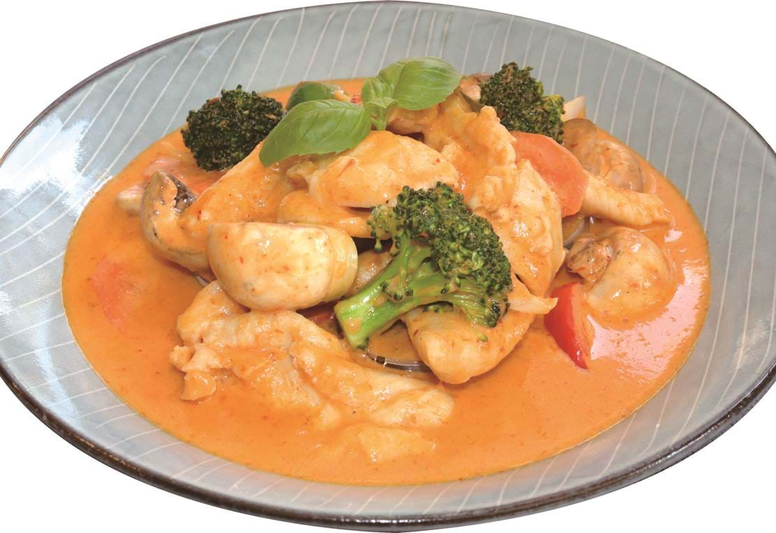 Thai rød karry med kokosmælk og blandet grøntsager. Vælg protein i mellem tofu, kylling, oksekød, and, kongerejer og laks.