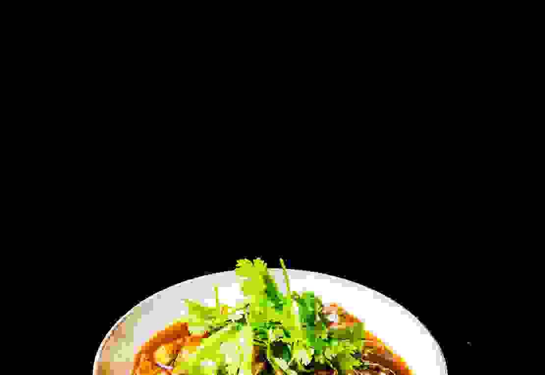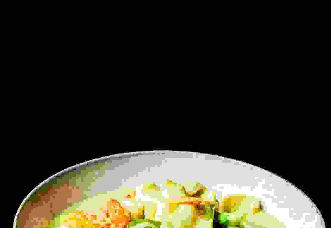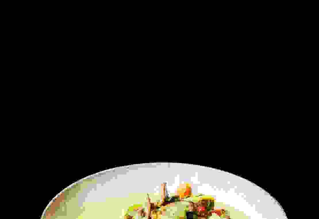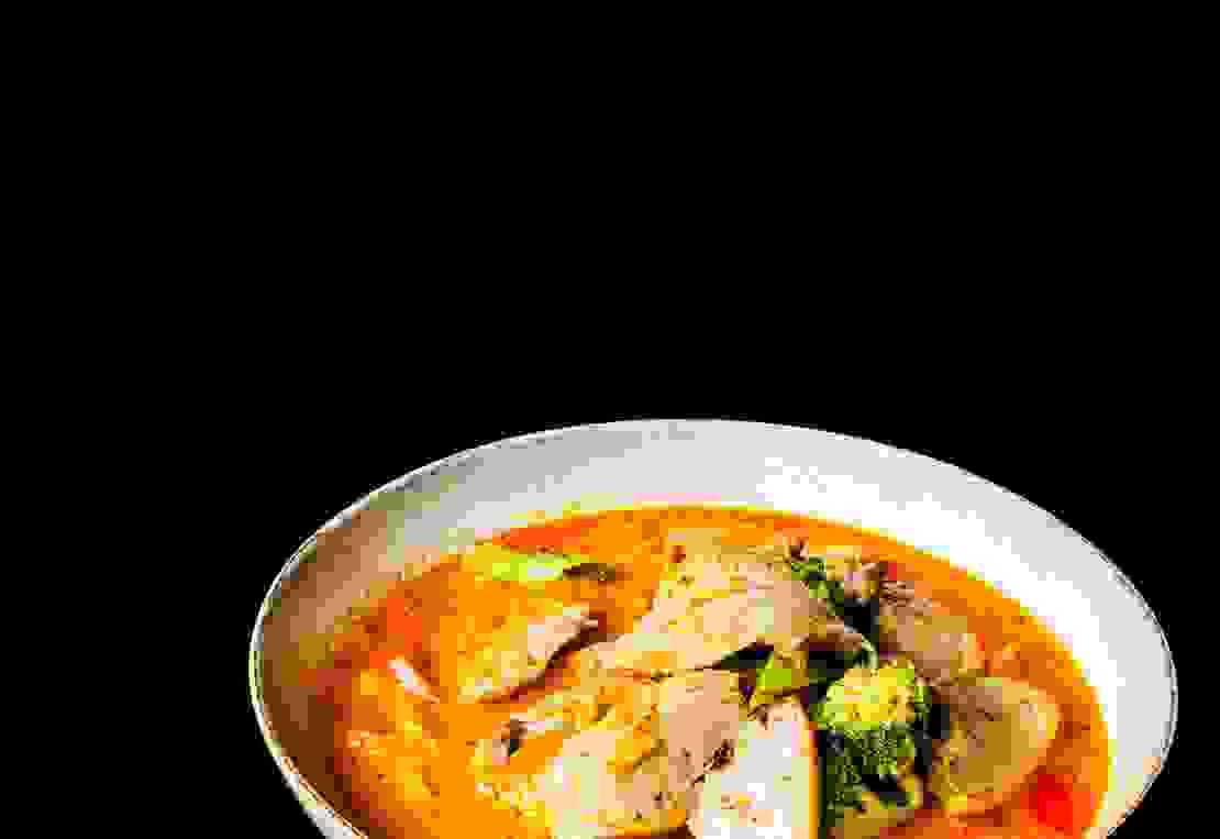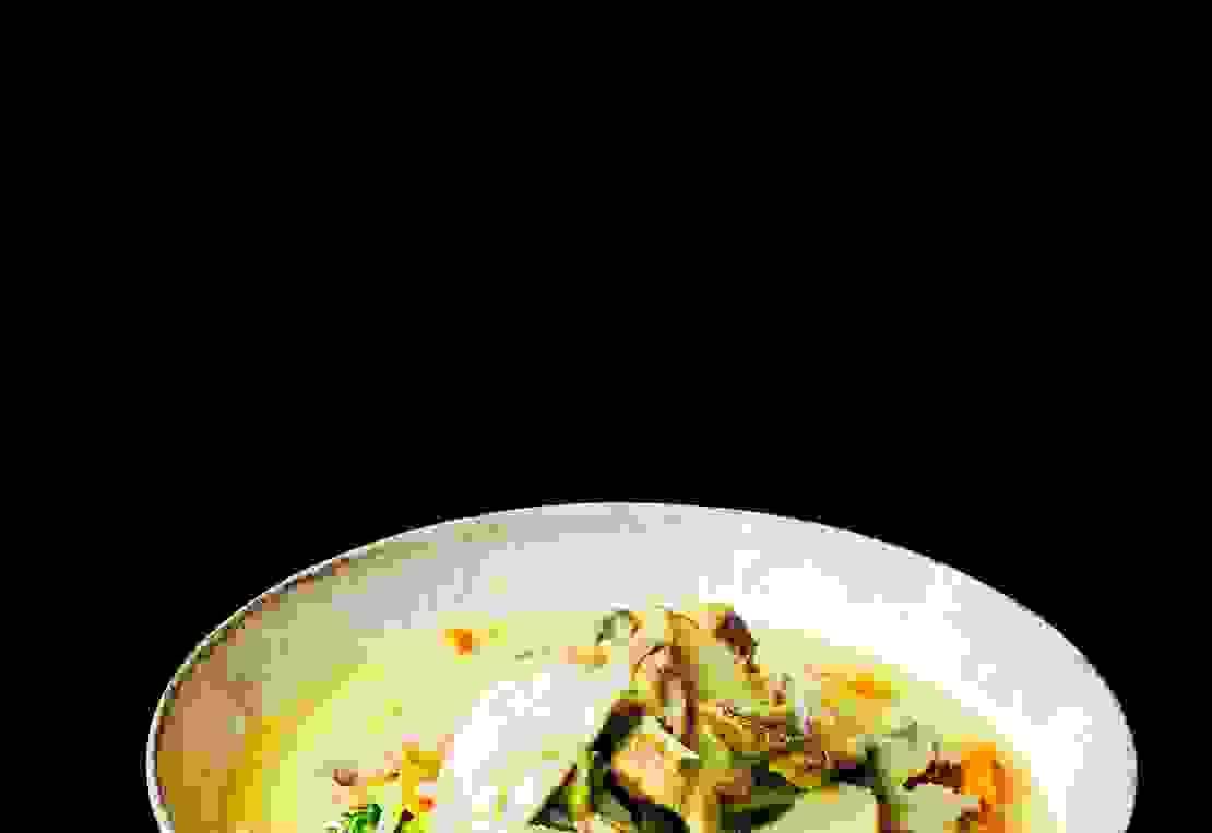 Thai grøn karry med kokosmælk og bladet grøntsager. Vælg protein i mellem tofu, kylling, oksekød, and, kongerejer og laks.