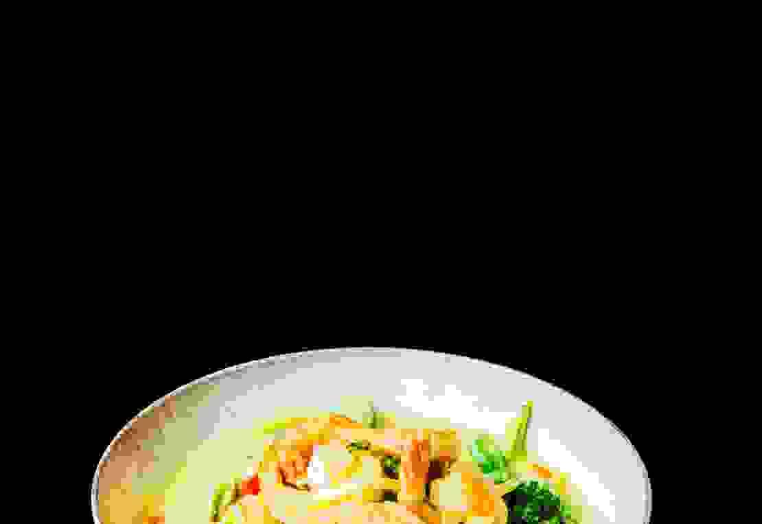 Thai gul karry med kokosmælk og blandet grøntsager. Vælg protein i mellem tofu, kylling, oksekød, and, kongerejer og laks.