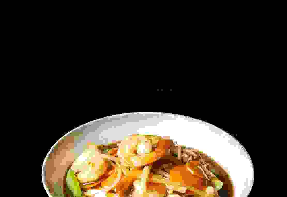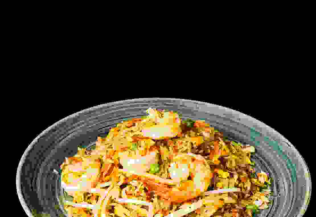 Thai risnudler med blandede grøntsager, knuste peanuts, lime og frisk koriander. Vælg protein i mellem tofu, kylling, oksekød, and, kongerejer og laks.
