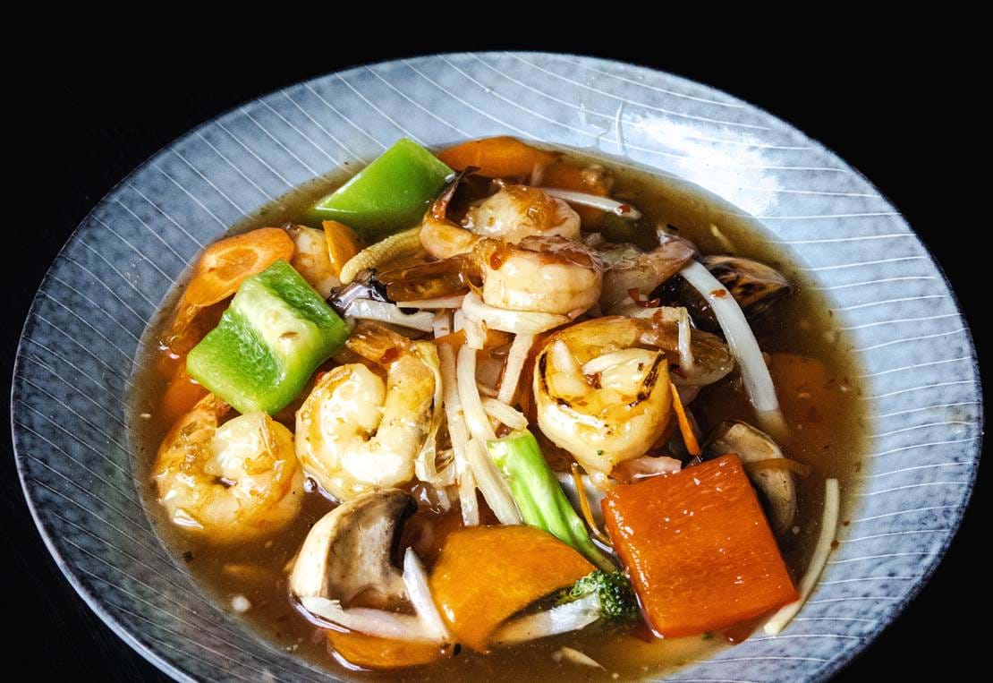 Thai stegte ris med blandede grøntsager. Vælg protein i mellem tofu, kylling, oksekød, and, kongerejer og laks.