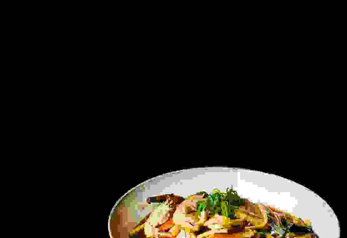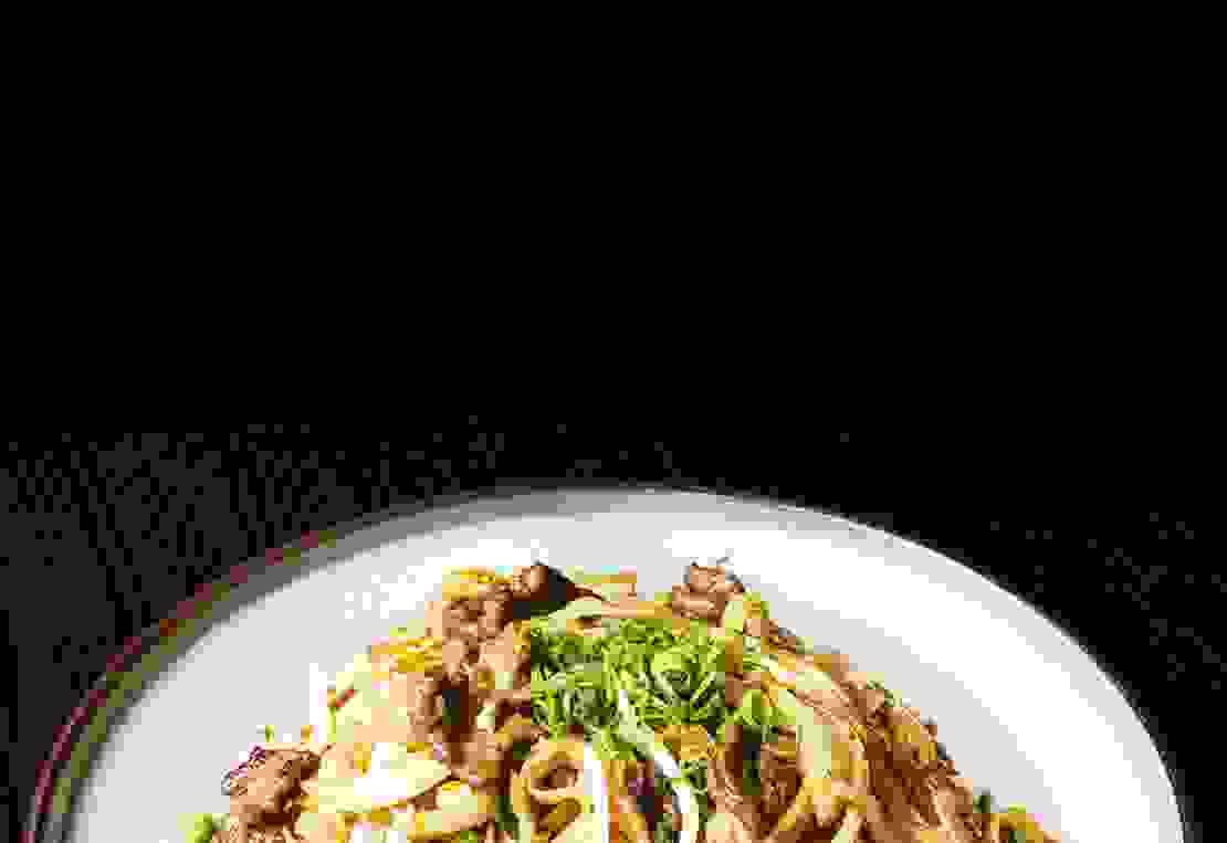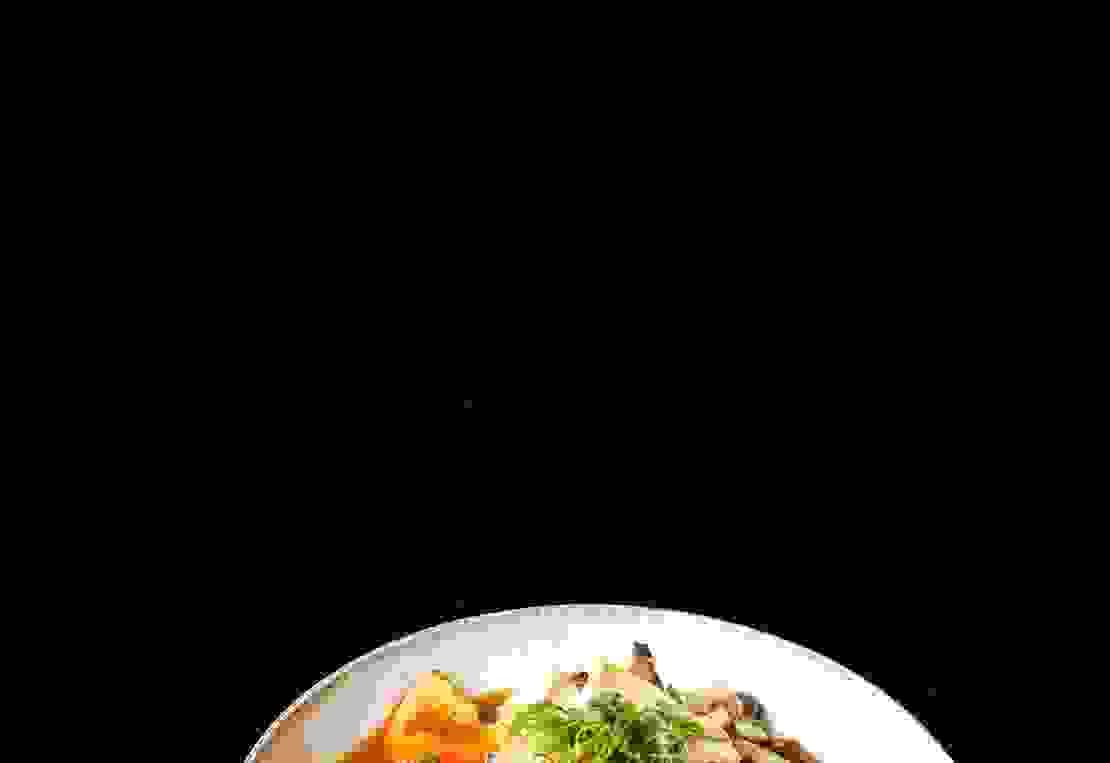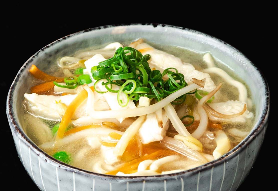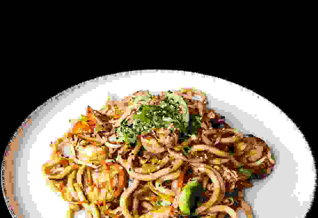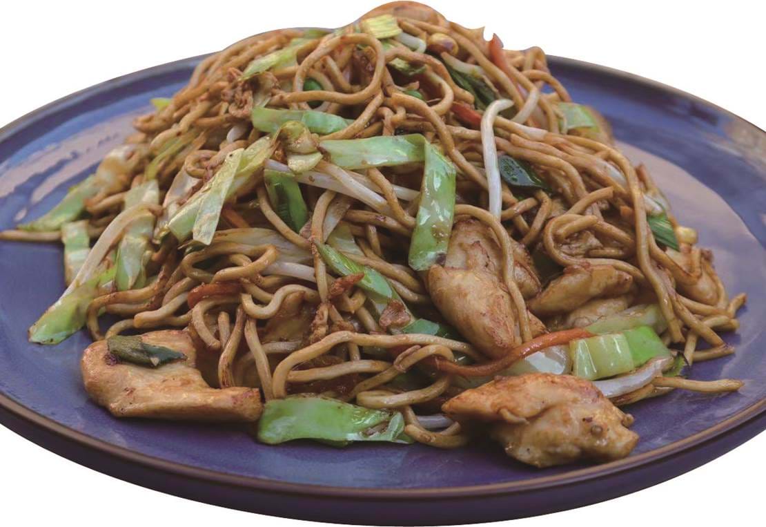 Udonnudler med sukkerærter, porrer, bønnespirer og peberfrugt. Tilberedes med valgfri protein.
