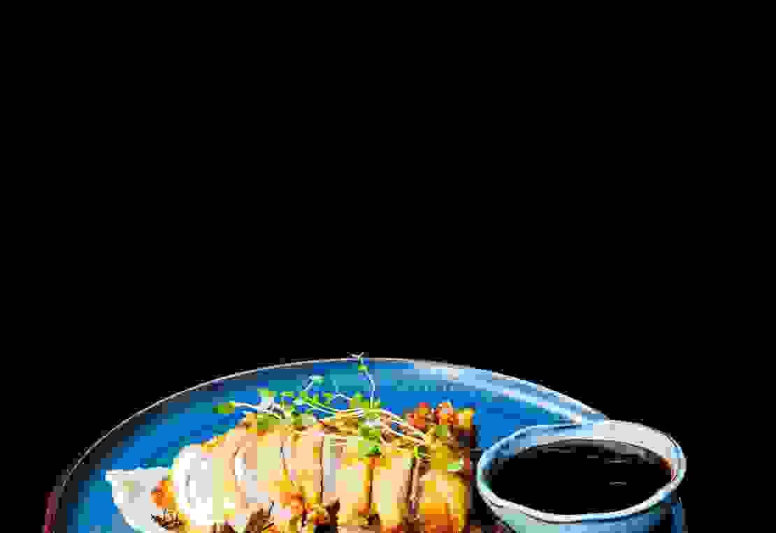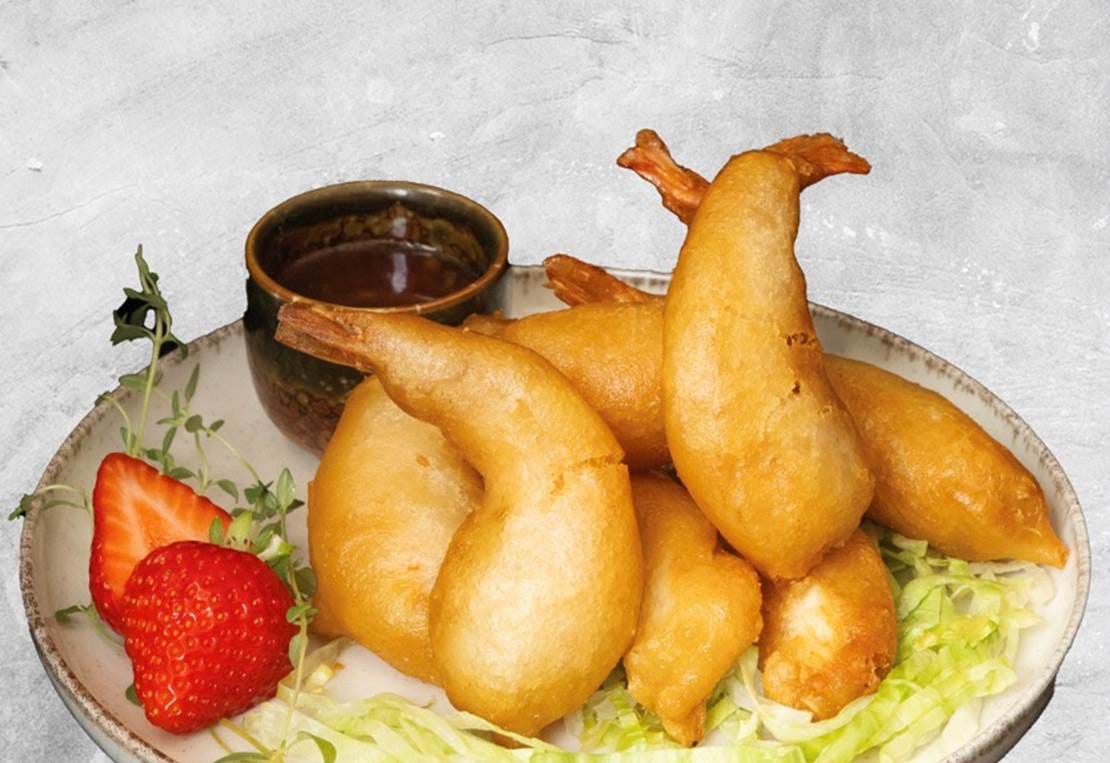 Paneret tigerrejer i teriyaki eller chilimayo.