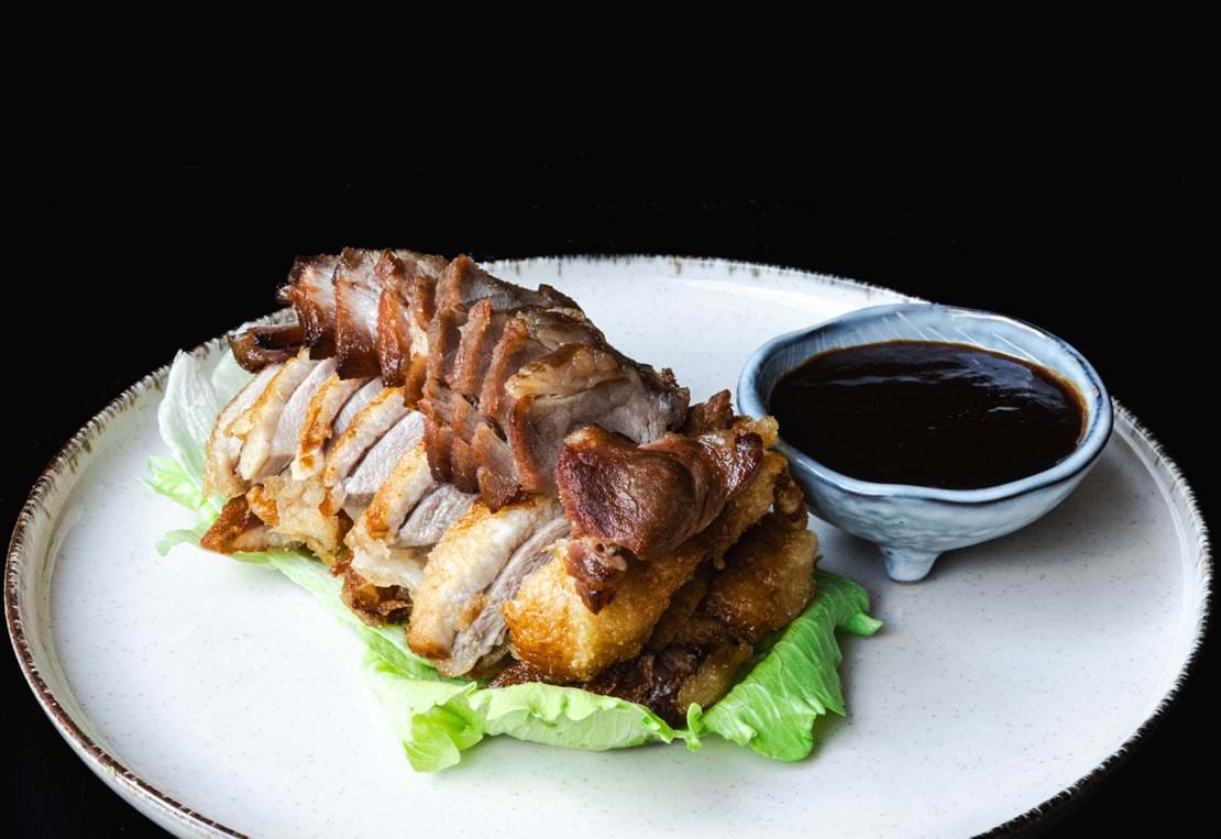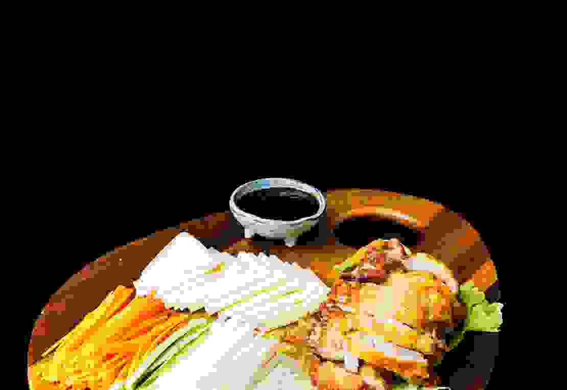 Serveret med pandekage, agurk, gulerødder, porre og hjemmelavet peking sauce.