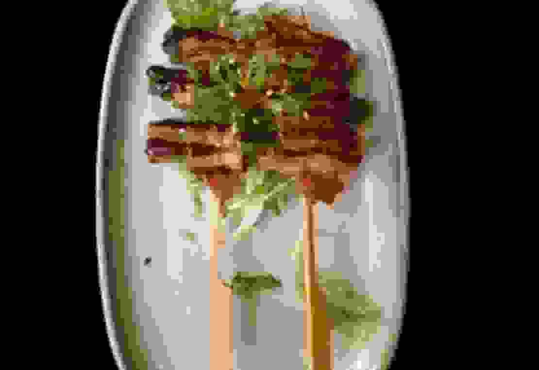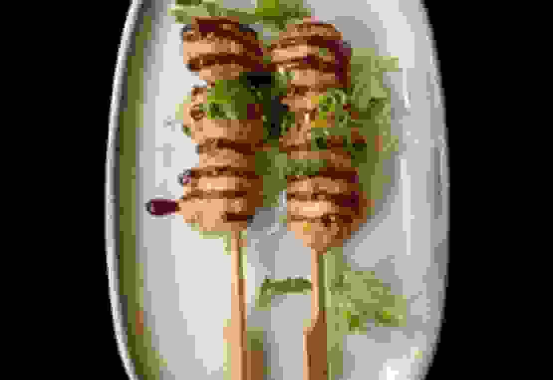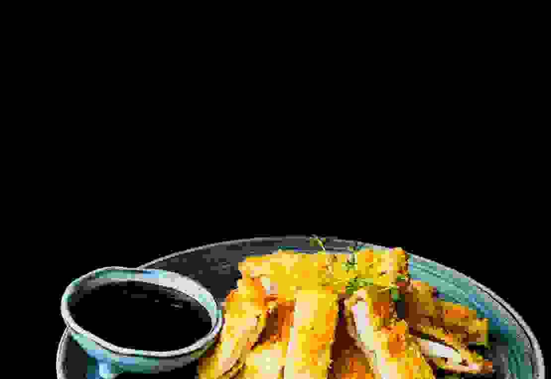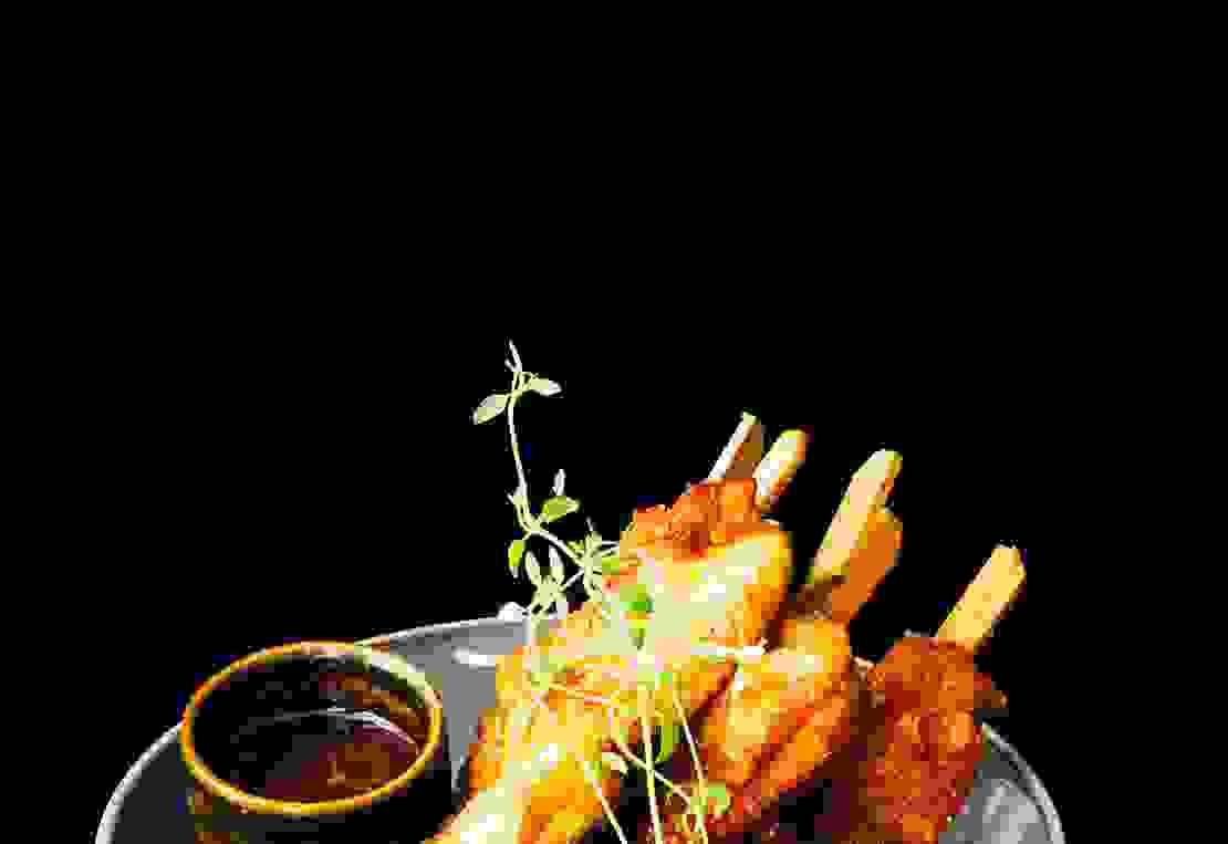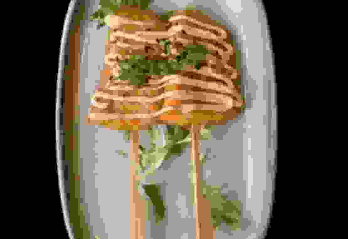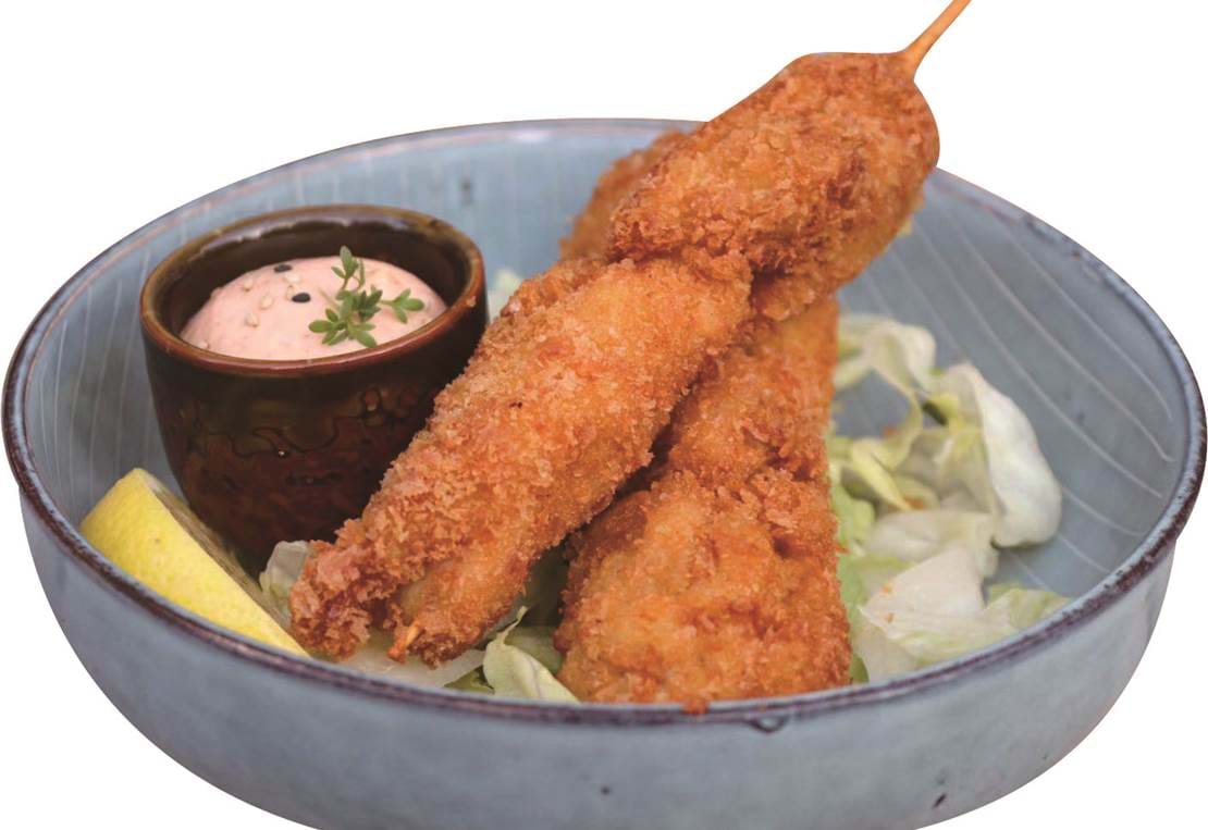 Paneret kyllingespyd i teriyaki sauce eller chilimayo.