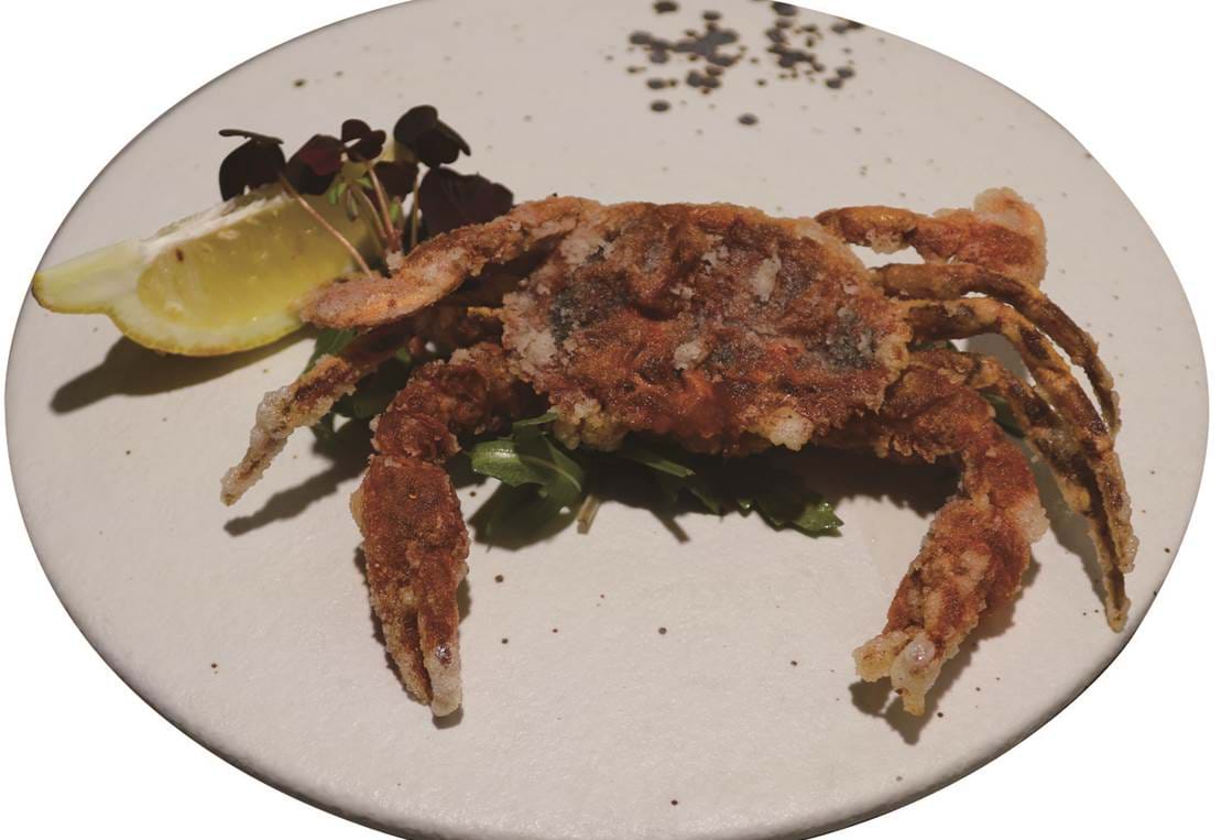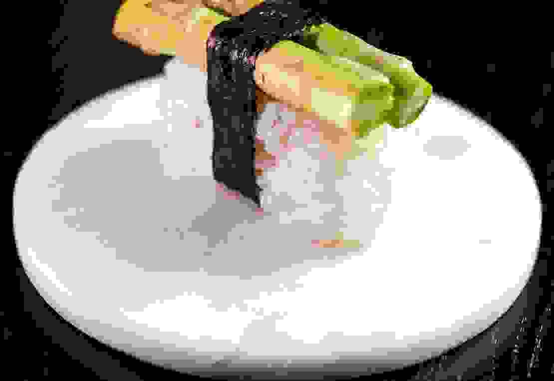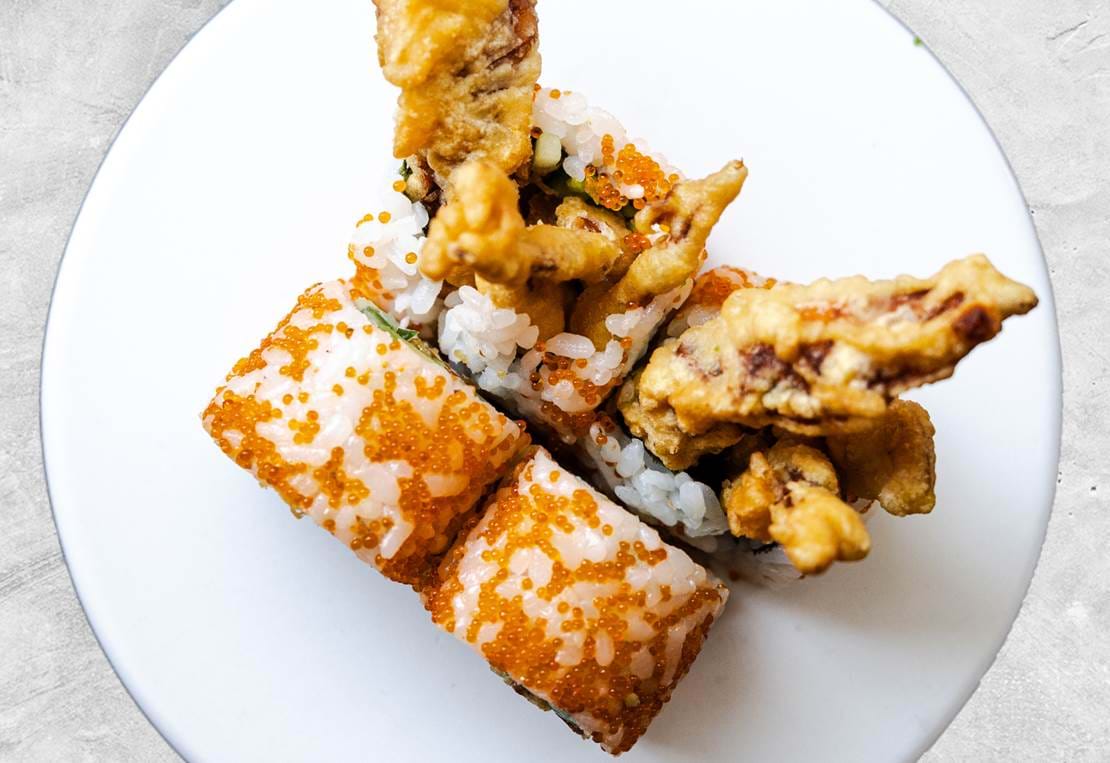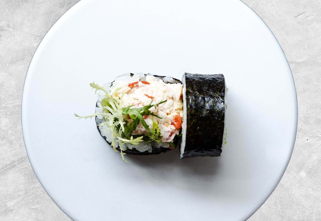 Softshell krabbe, forårsløg, avokado, agurk, chilimayo sauce, rullet i masago.