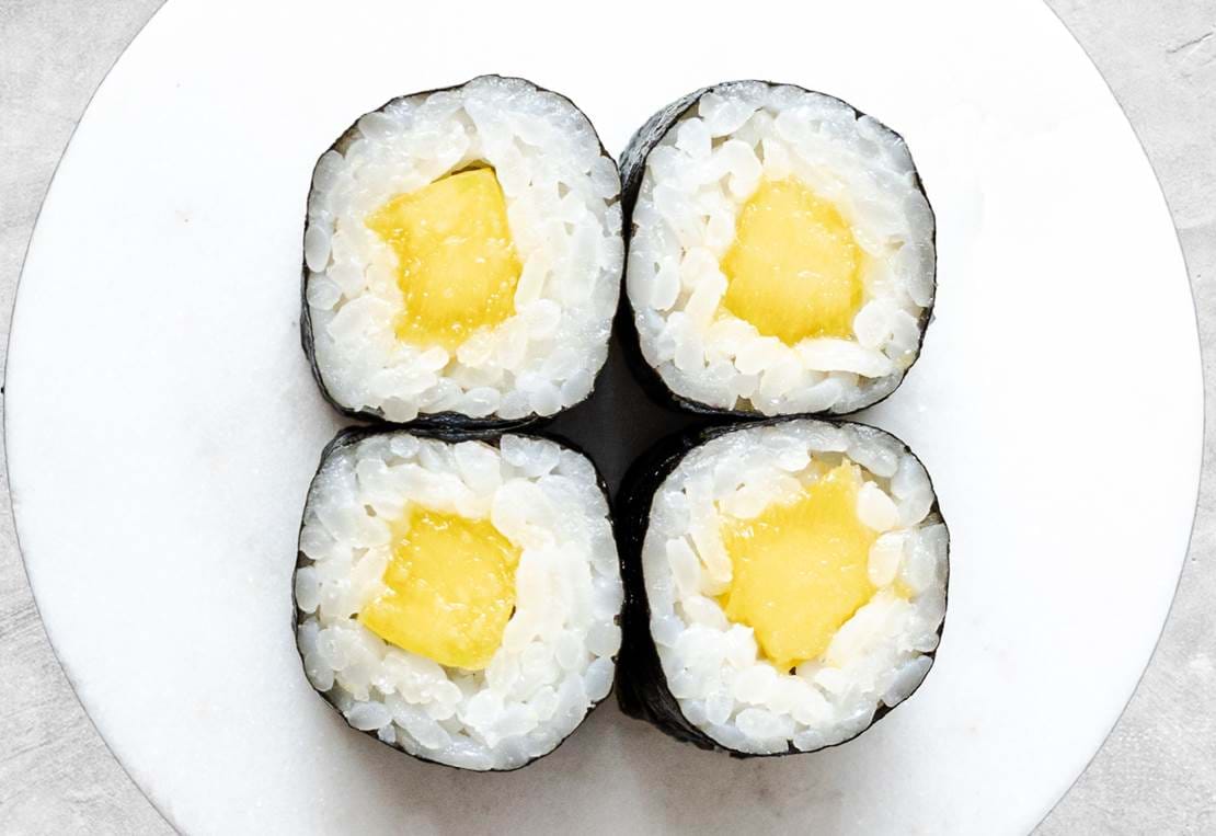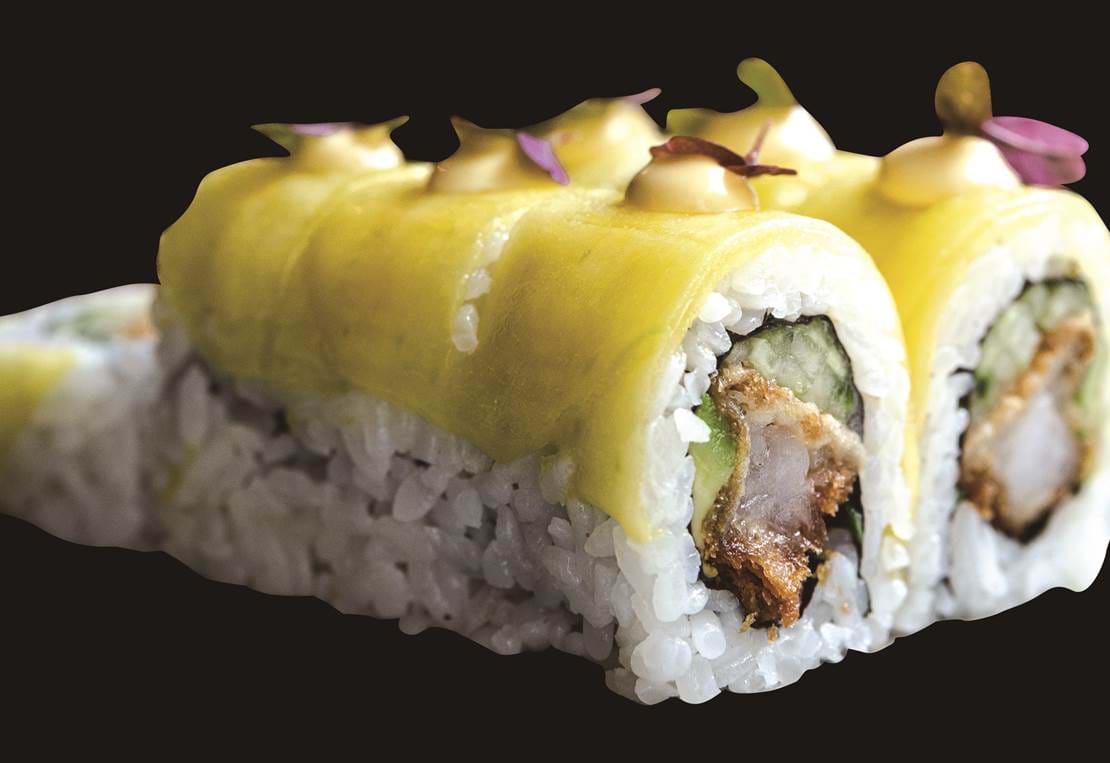 Tun, avokado, agurk forårsløg rullet i frisk mango.