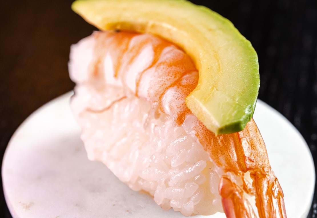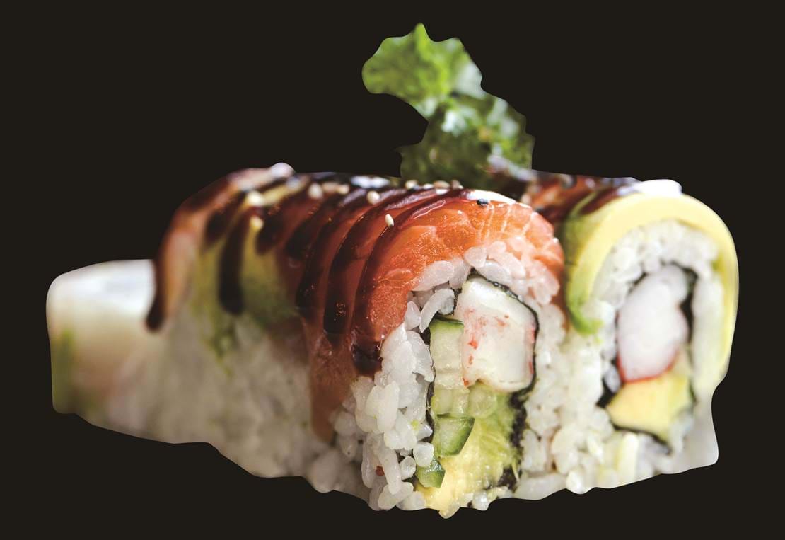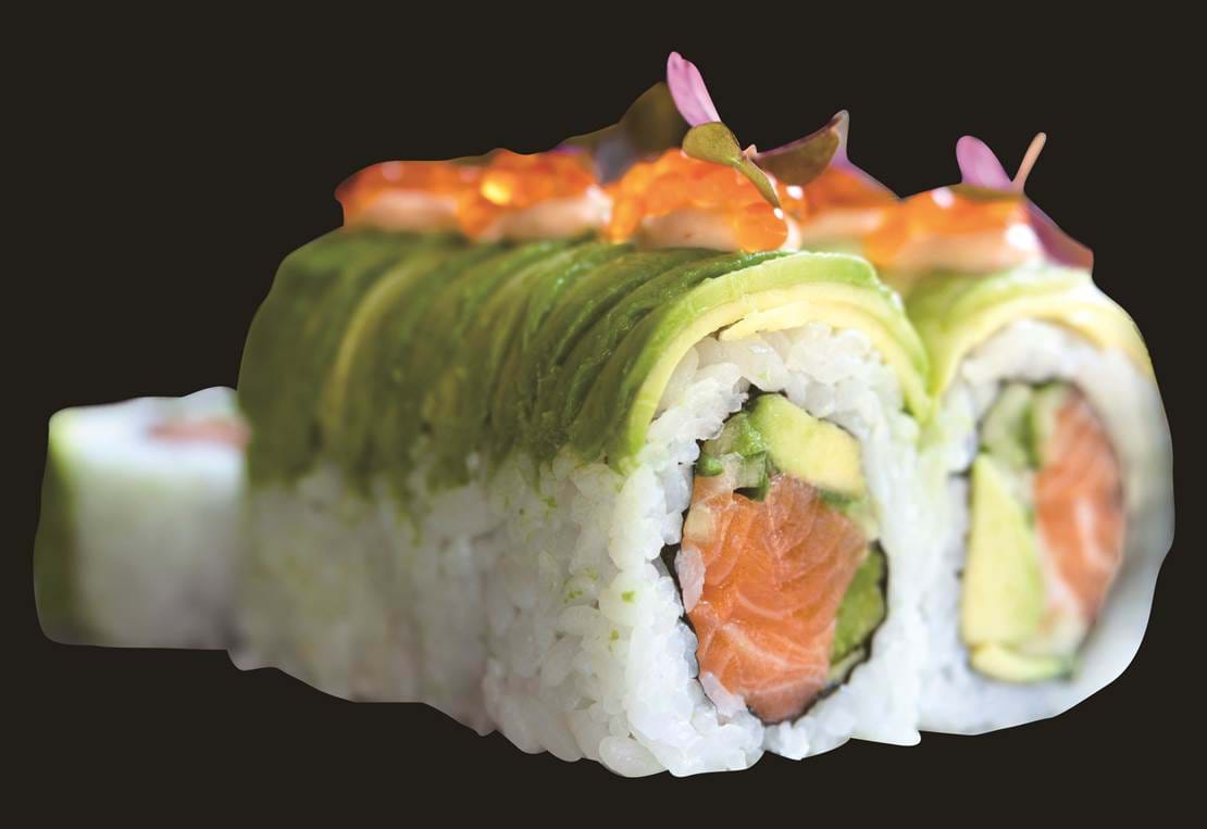 Crabstick, avocado, agurk og kewpie, toppet med tun, laks, yellowtail, reje, avokado.