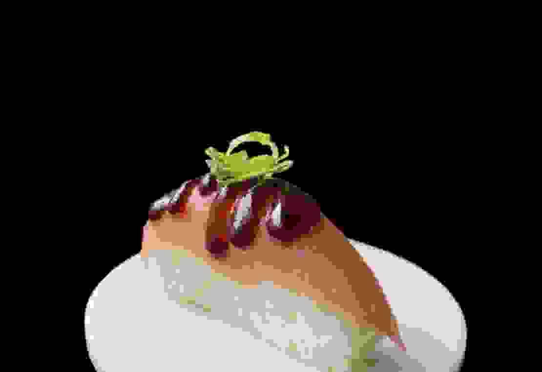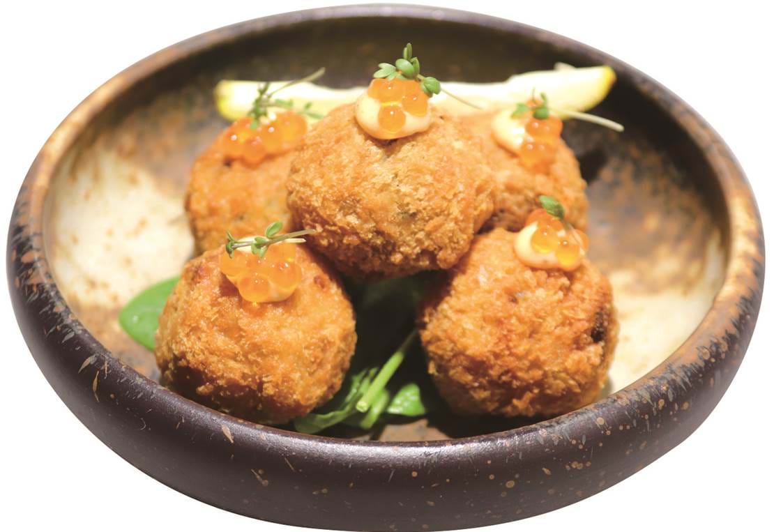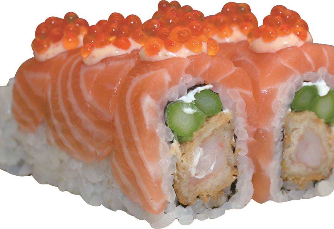 Crispy rejer, asparges, flødeost, toppet med laks, chilimayo og ørredrogn.