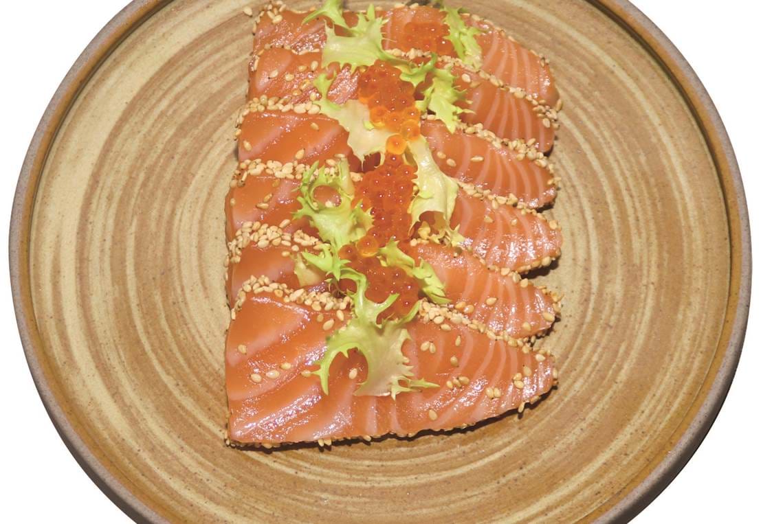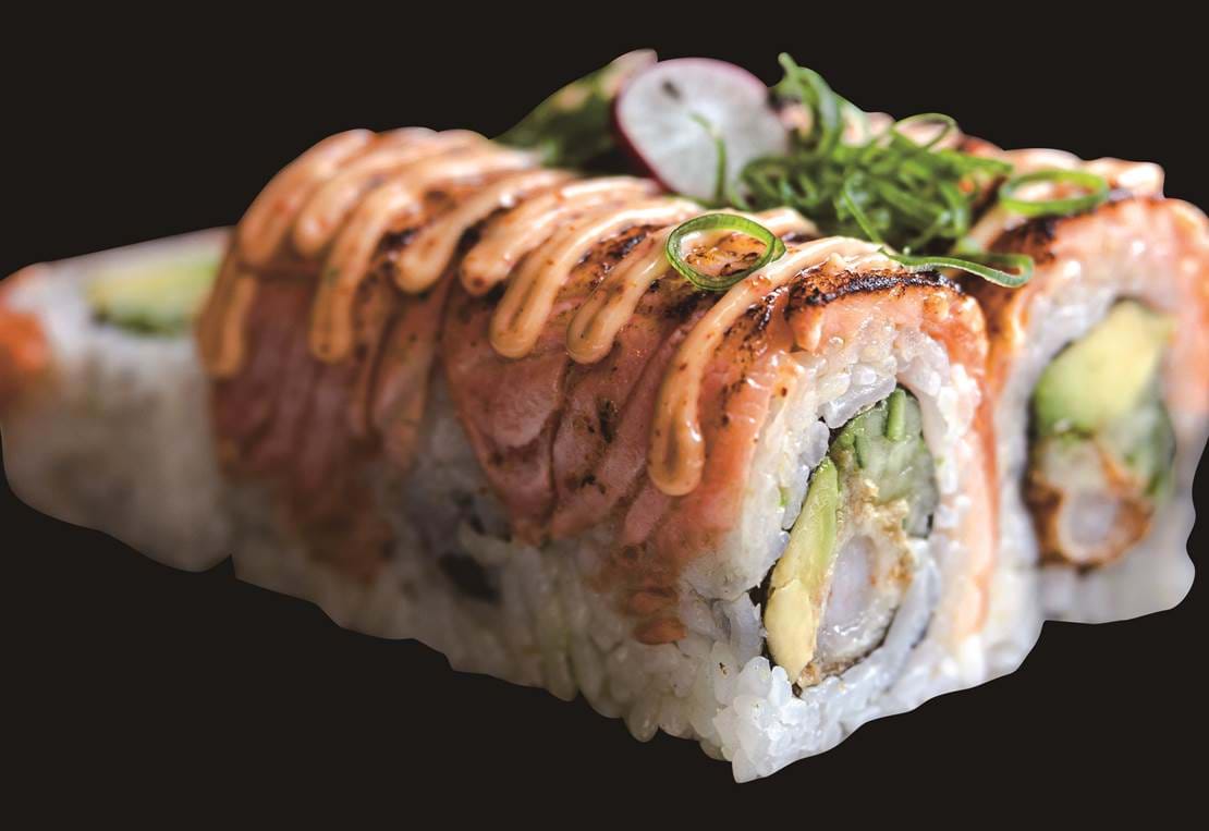 Crispy rejer, mango og agurk, toppet med flammegrillet laks, sesam, forårsløg, teriyaki sauce og spicysauce.