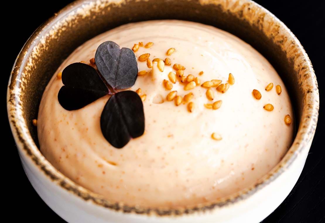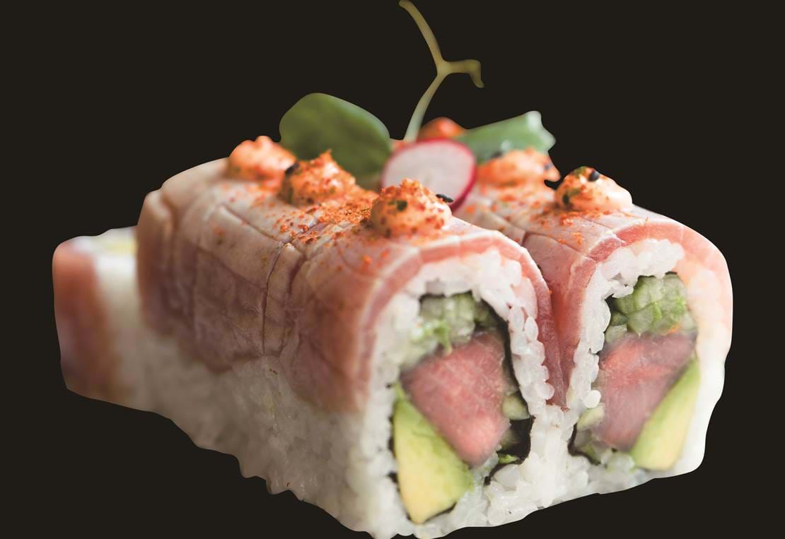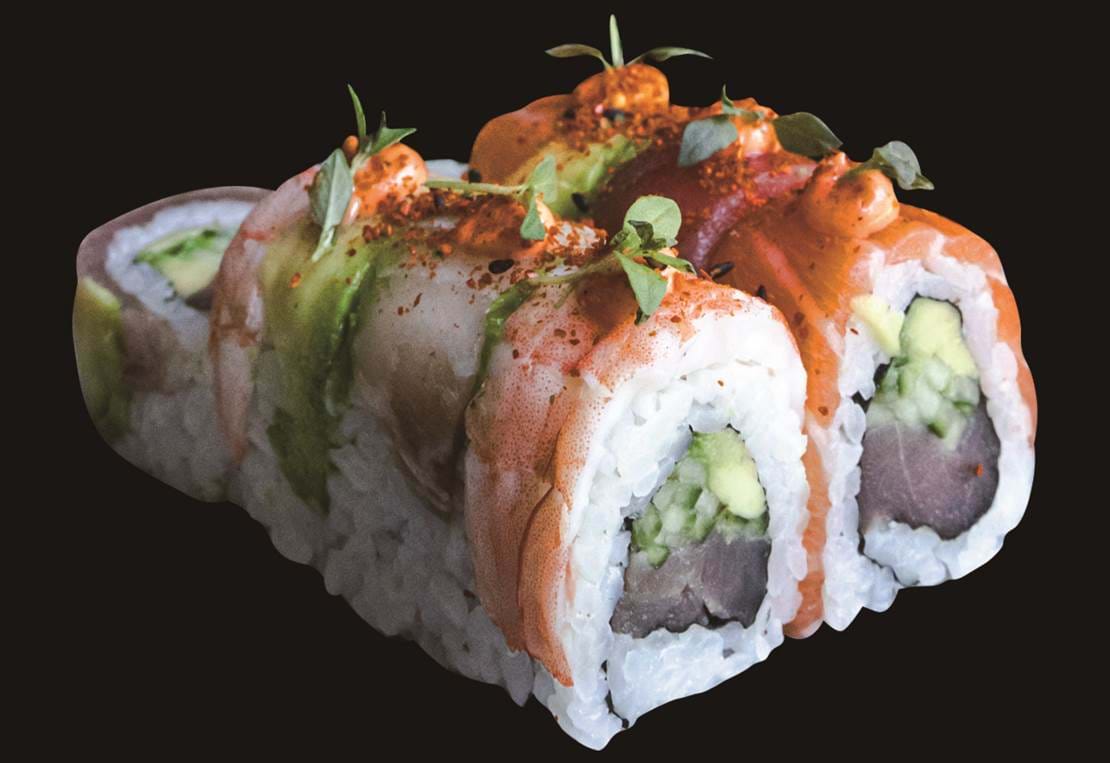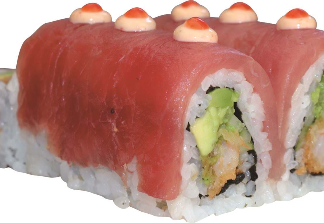 Tuntatar, avokado, agurk og spicysauce, toppet med tun, laks, yellowtail, reje, avokado og spicy sauce.