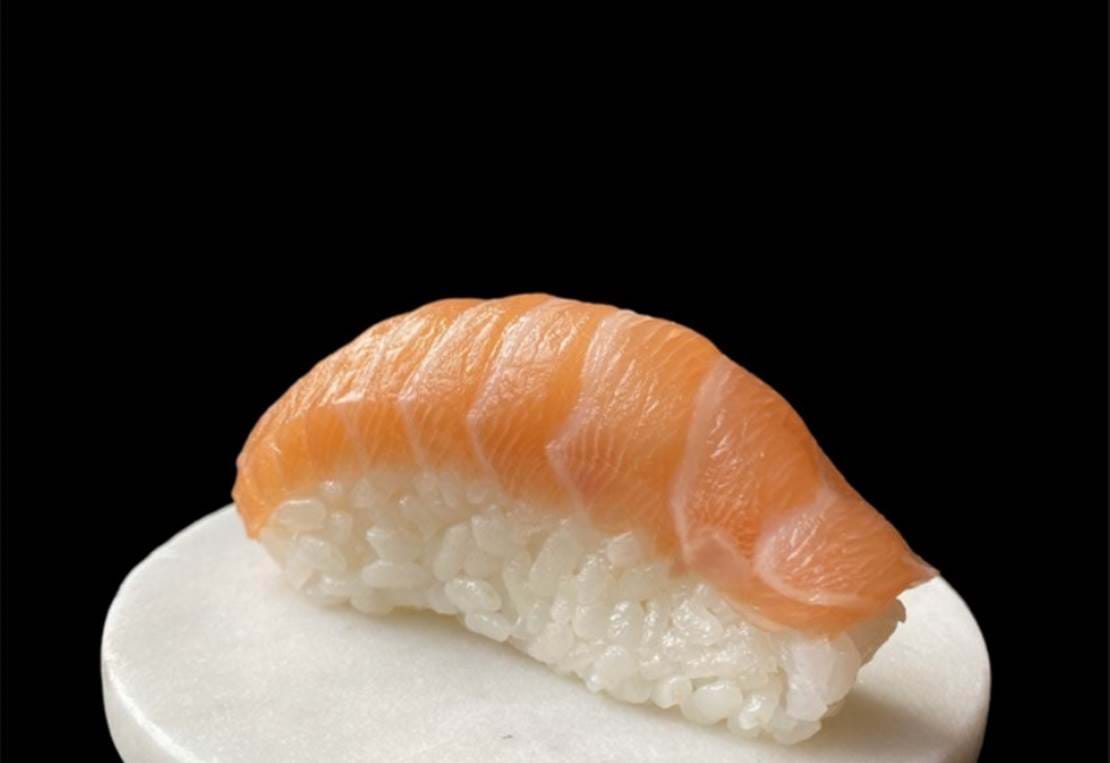 Sashimi af laks, anrettet med fint revet kinaradise og en portion sushi ris med teriyakisauce.