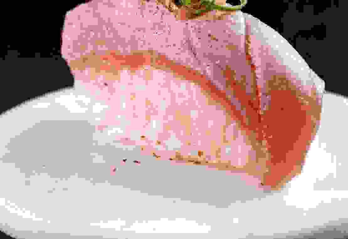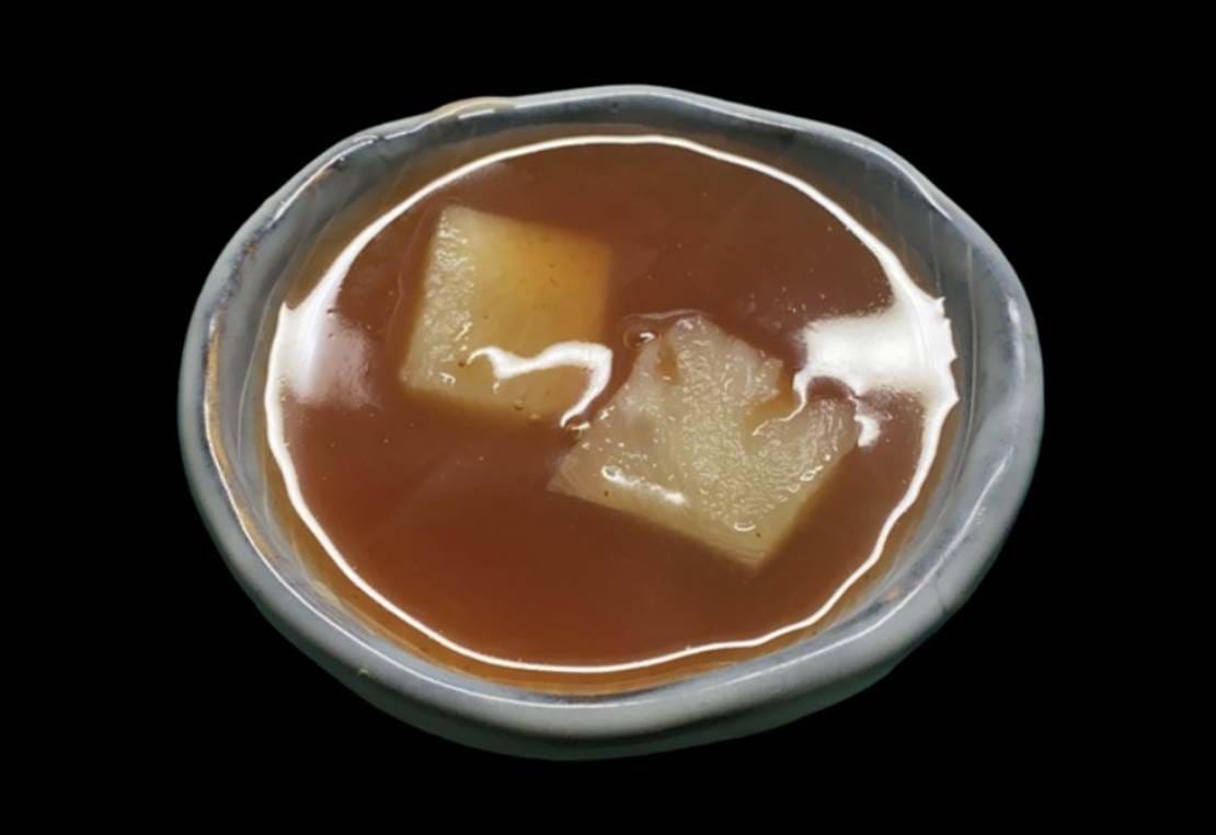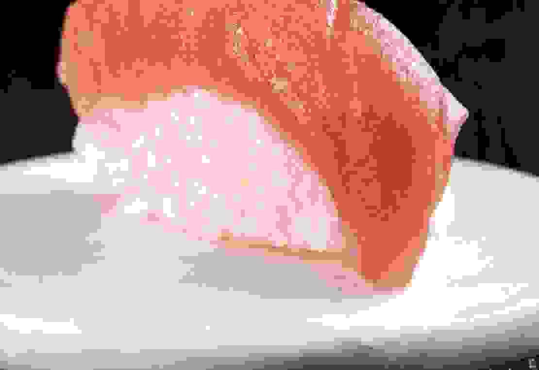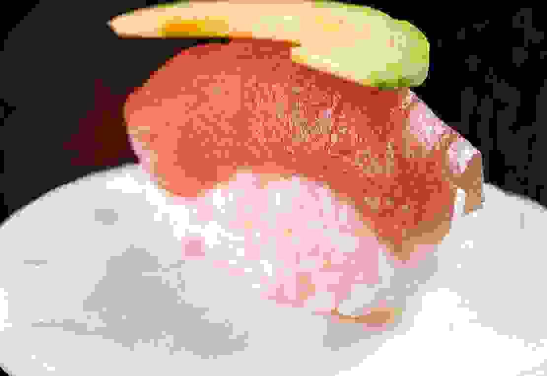 Sashimi af tun, anrettet med fint revet kinaradise og en portion sushi ris med teriyakisauce.