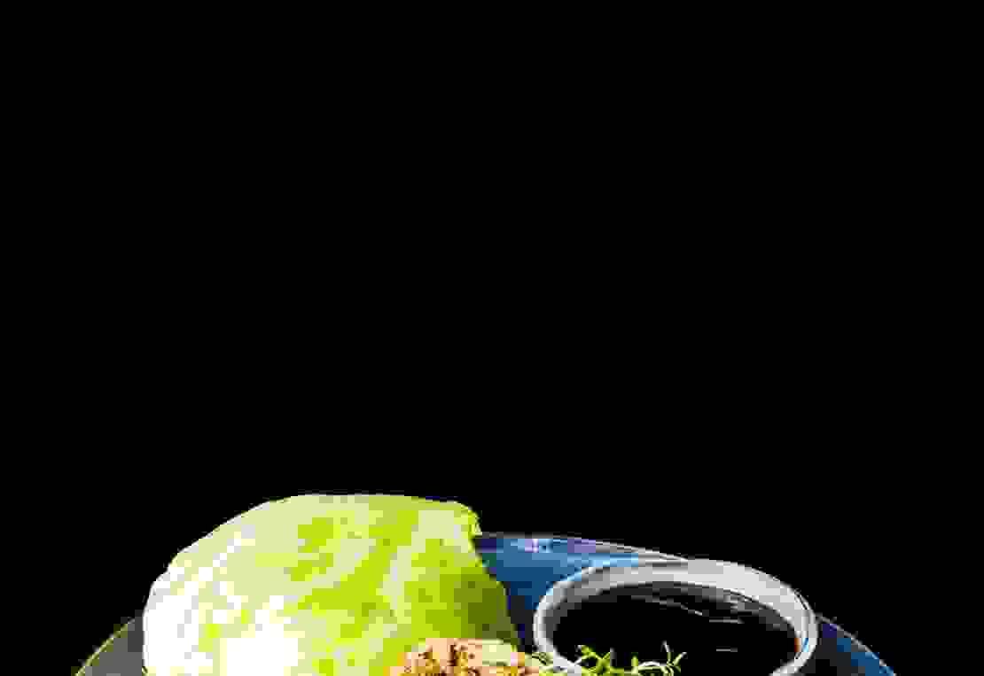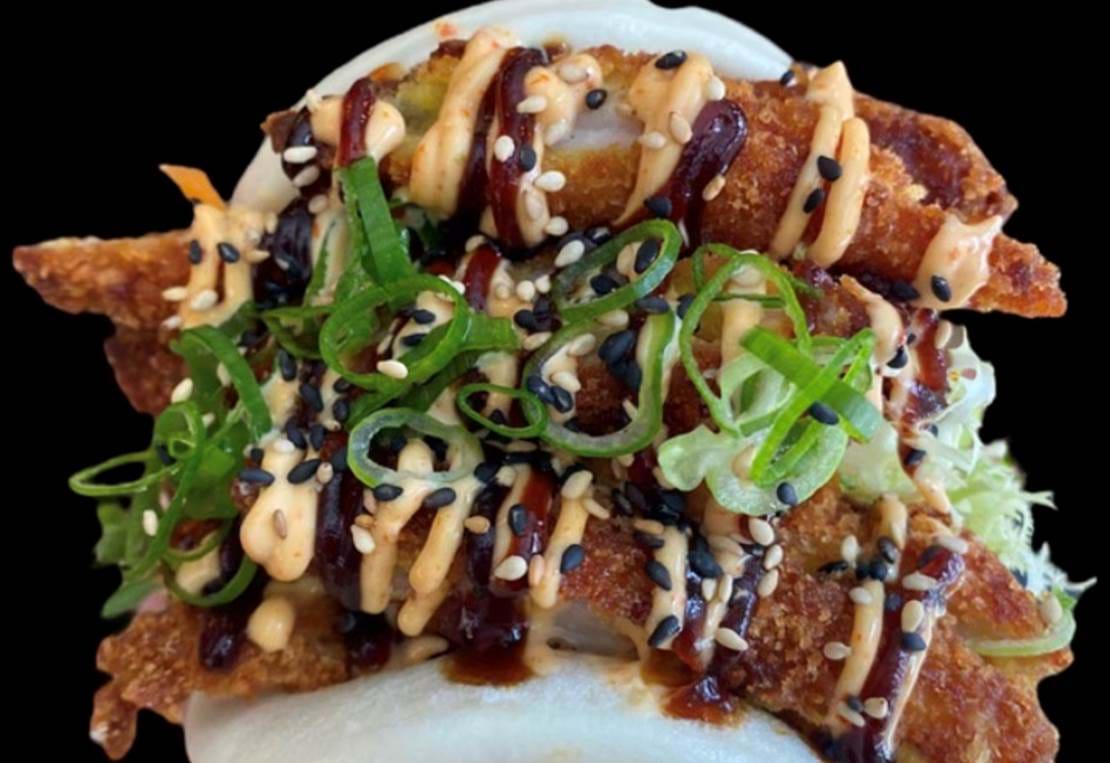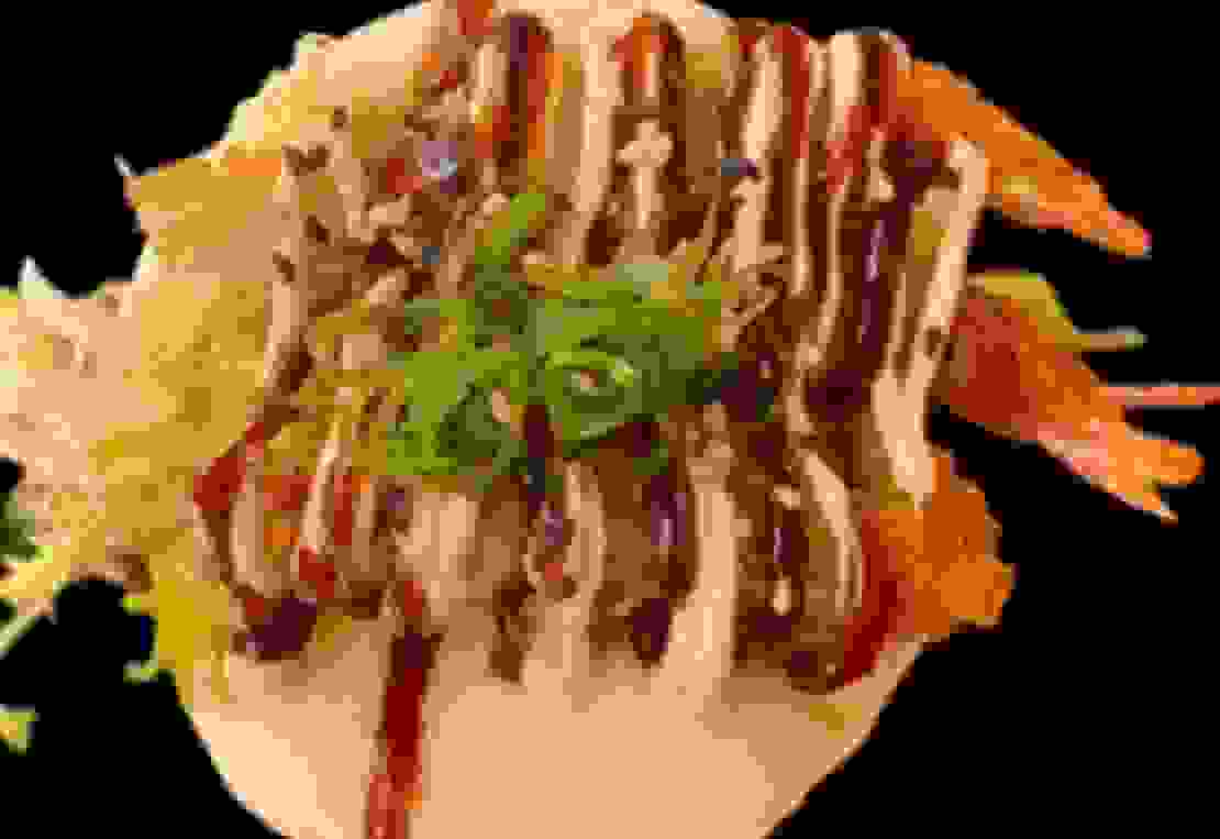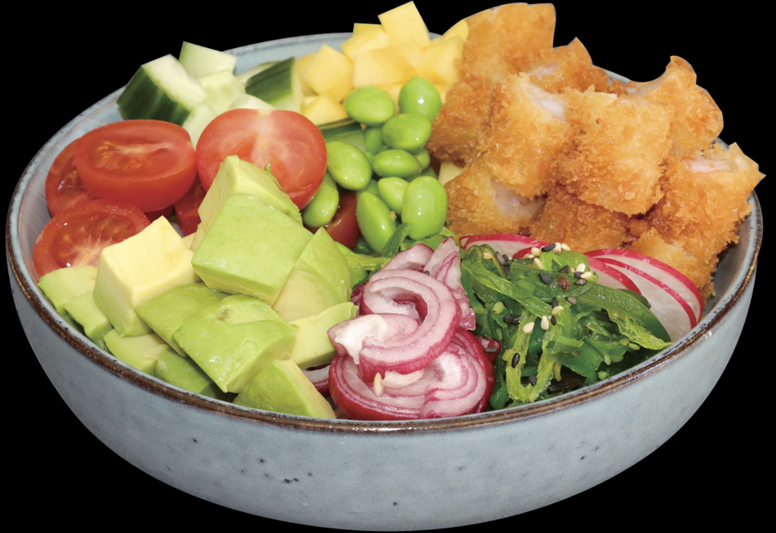 Crispy kakiyaki, avokado, agurk, spæde salatblade med chilimayo sauce og teriyakisauce.