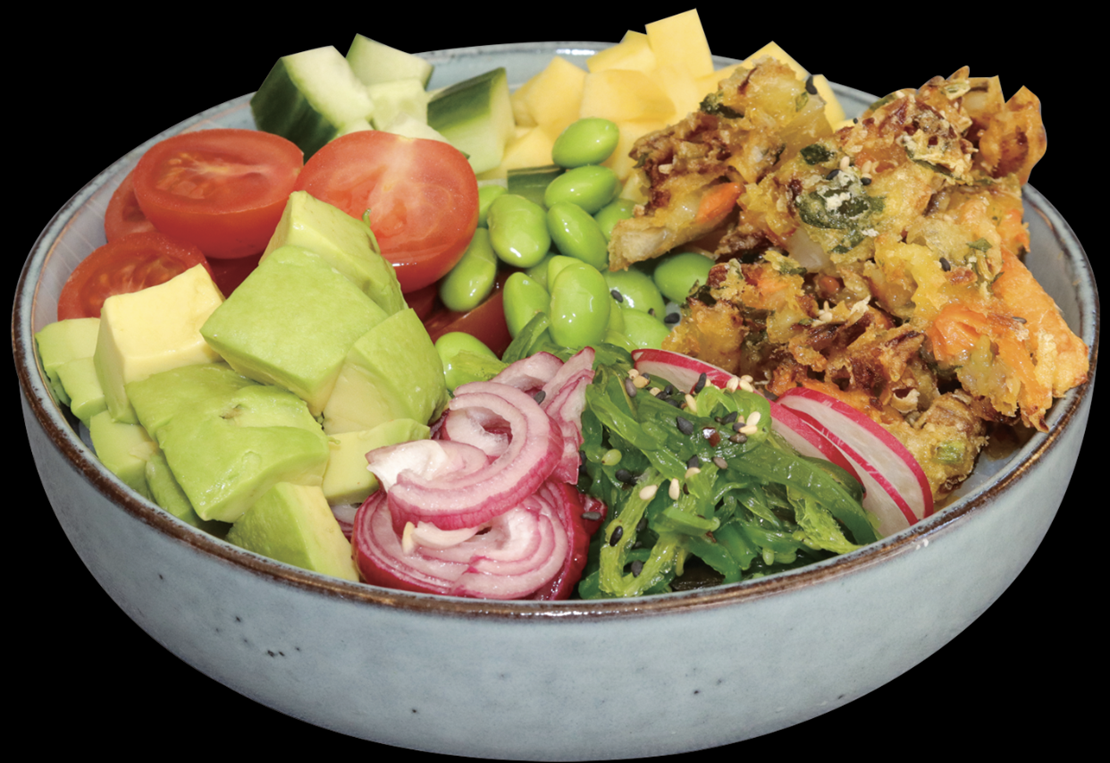 Ris, tempura kakiyaki, agurk, avokado, tangsalat, edamame, radiser, mango, ingefær og forårsløg.