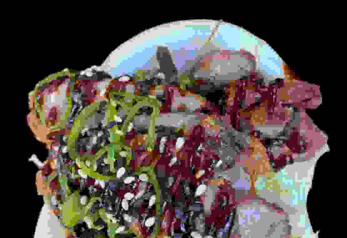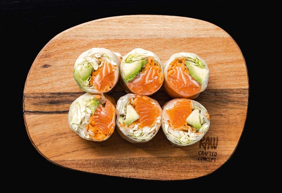 Crispy rejer, avocado, agurk, toppet med flammegrillet laks, chilimayo, sort peber og forårsløg.