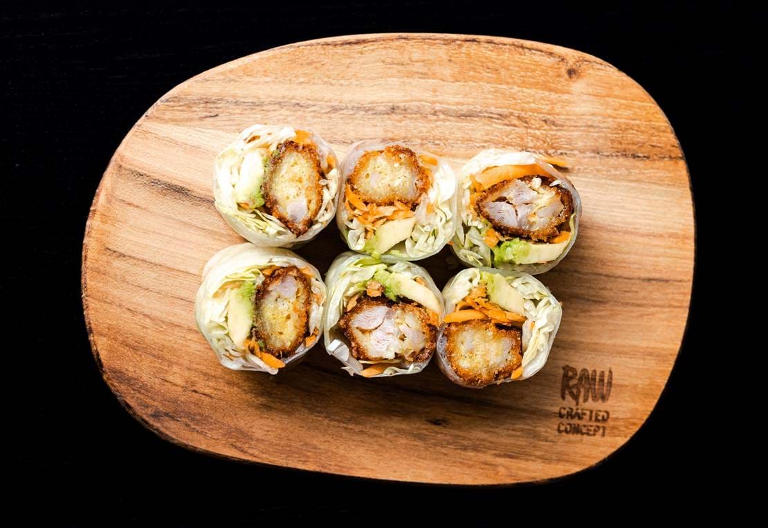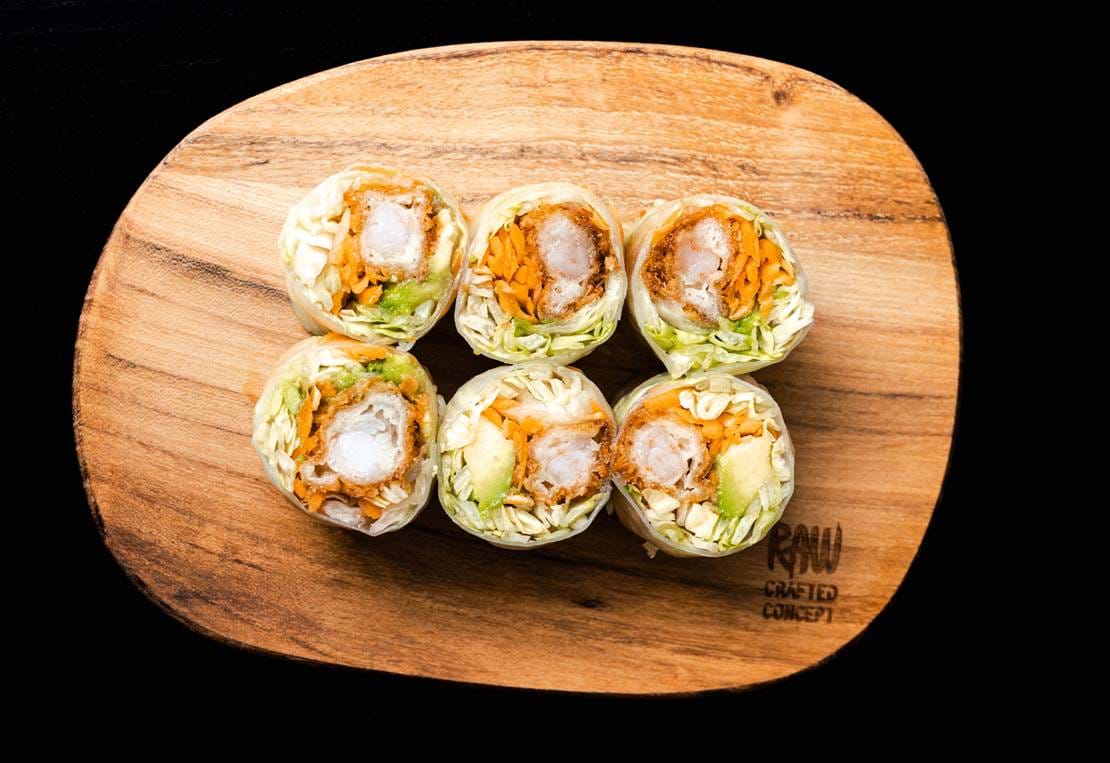 Crispy rejer, avokado, agurk, spæde salatblade og spicysauce.
