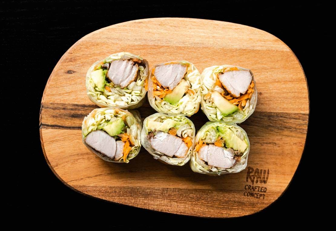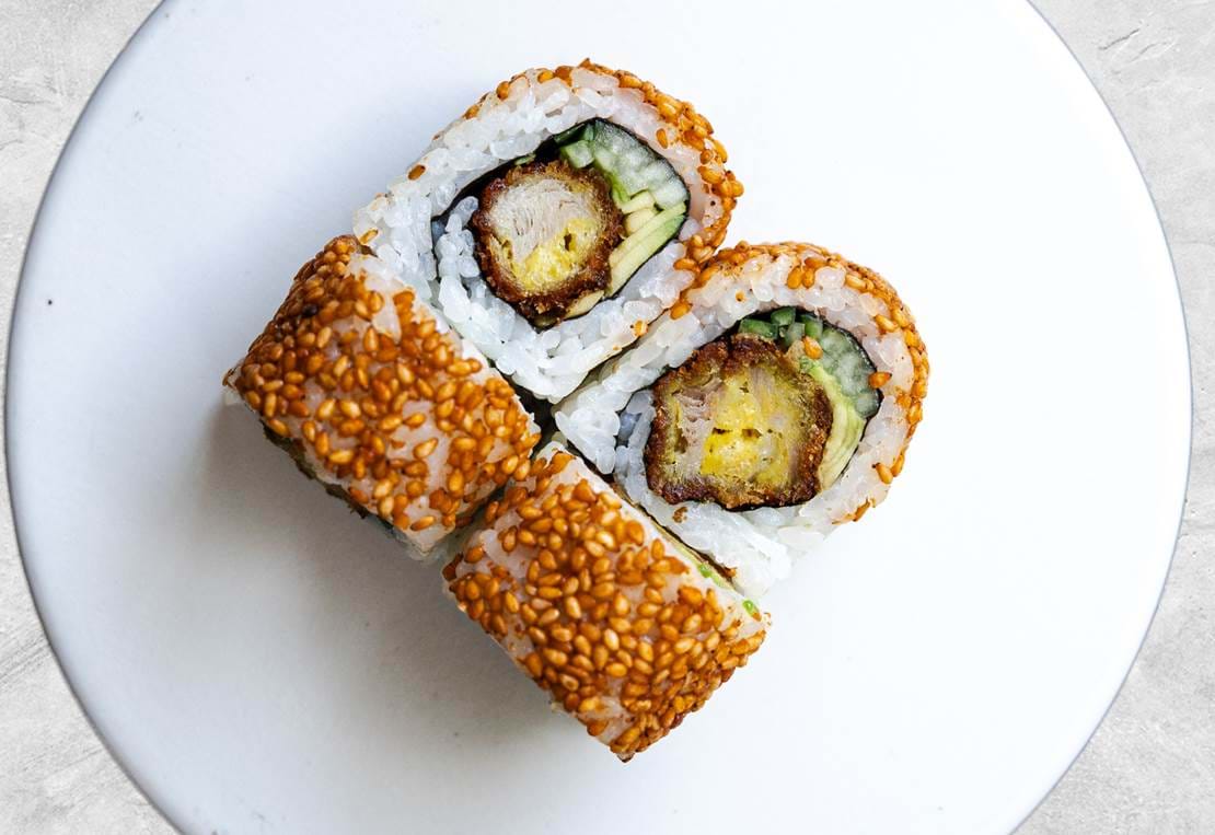 Stegt kylling, avokado, agurk, teriyaki sauce, rullet i chili sesam.