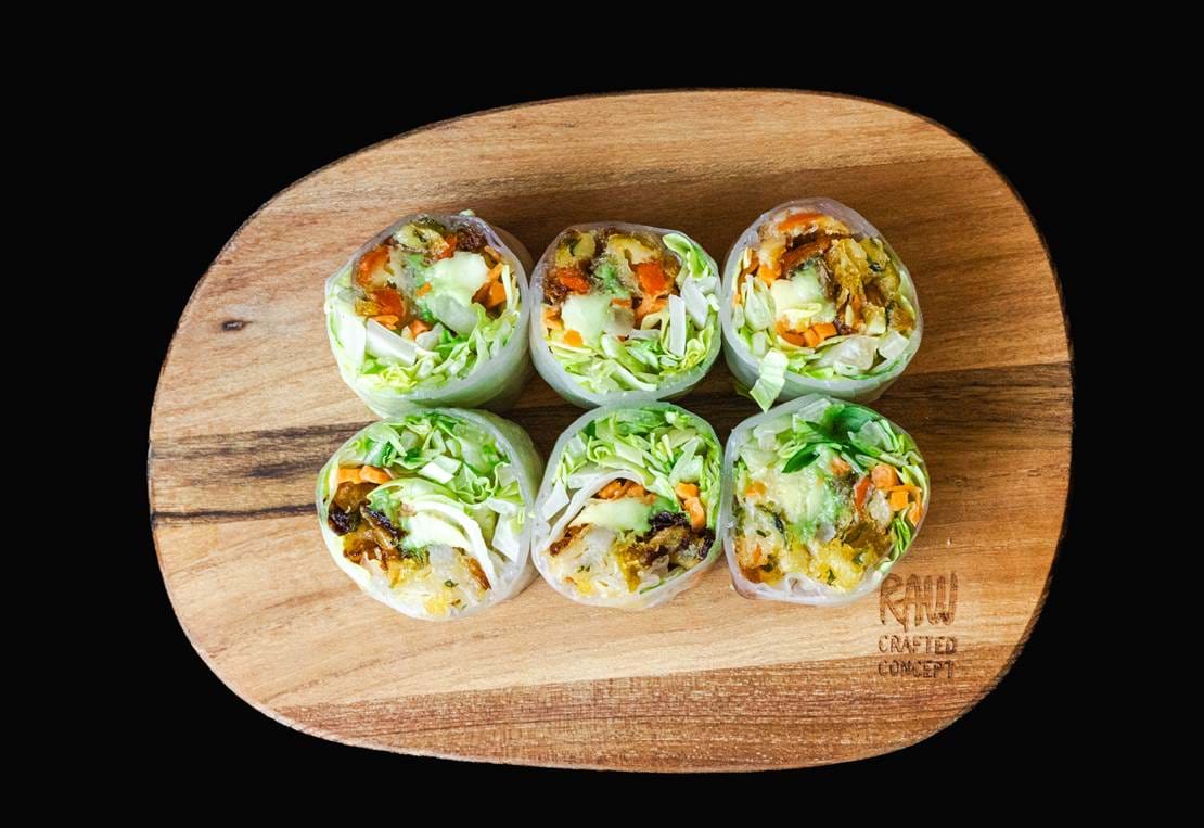 Crispy kylling, avokado, agurk, spæde salatblade, spicysauce og teriyakisauce.