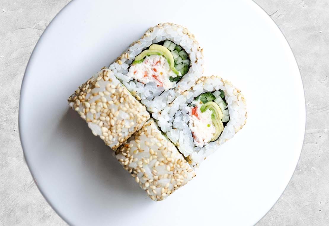 Surimi, kewpie, avokado, agurk, rullet i sesam.