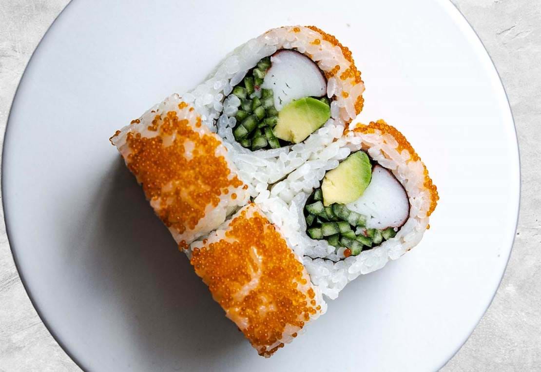 Crabstick, avokado, agurk, kewpie, rullet i tobiko.