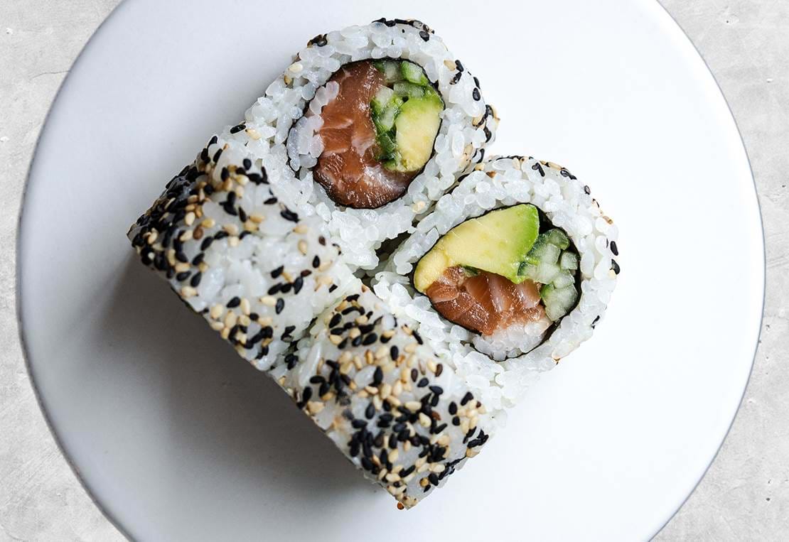 Laks, avokado, agurk, spæde salatblade og teriyakisauce