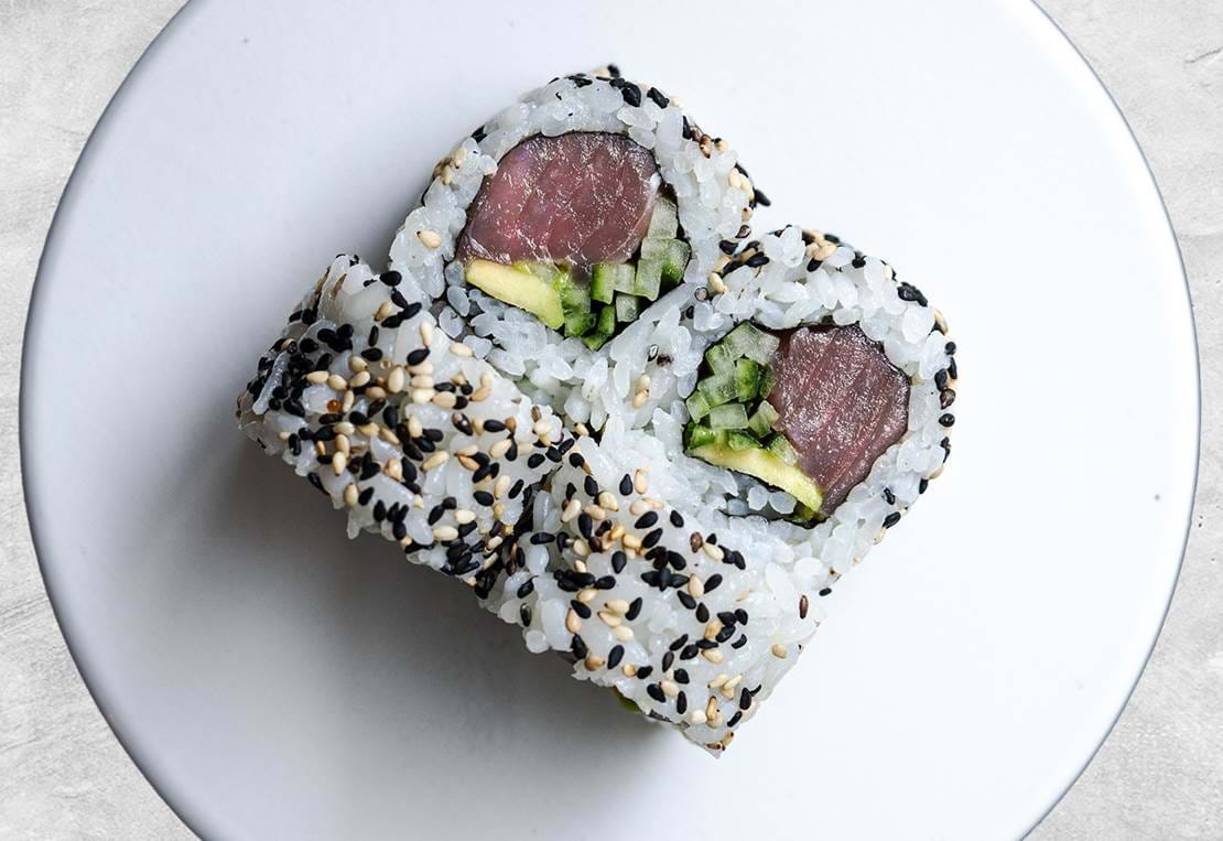 Tun, avokado, agurk, spicy sauce, rullet i sesam