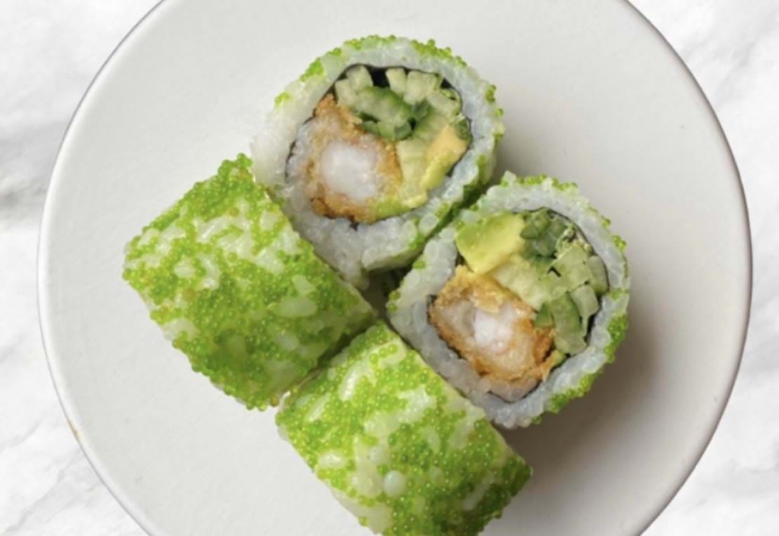 Crispy rejer, forårsløg, avokado, agurk, spicy sauce, rullet i wasabi tobiko.