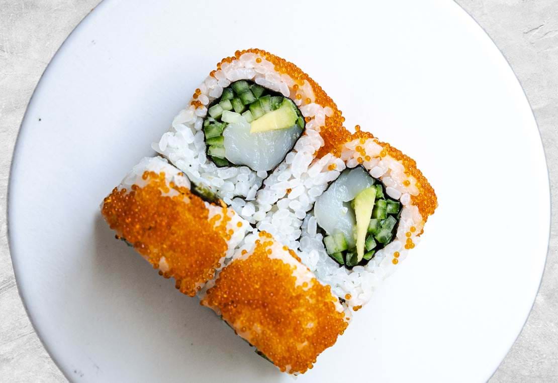 Kammusling, kewpie, avokado, agurk, rullet i masago.