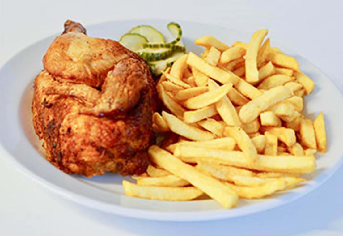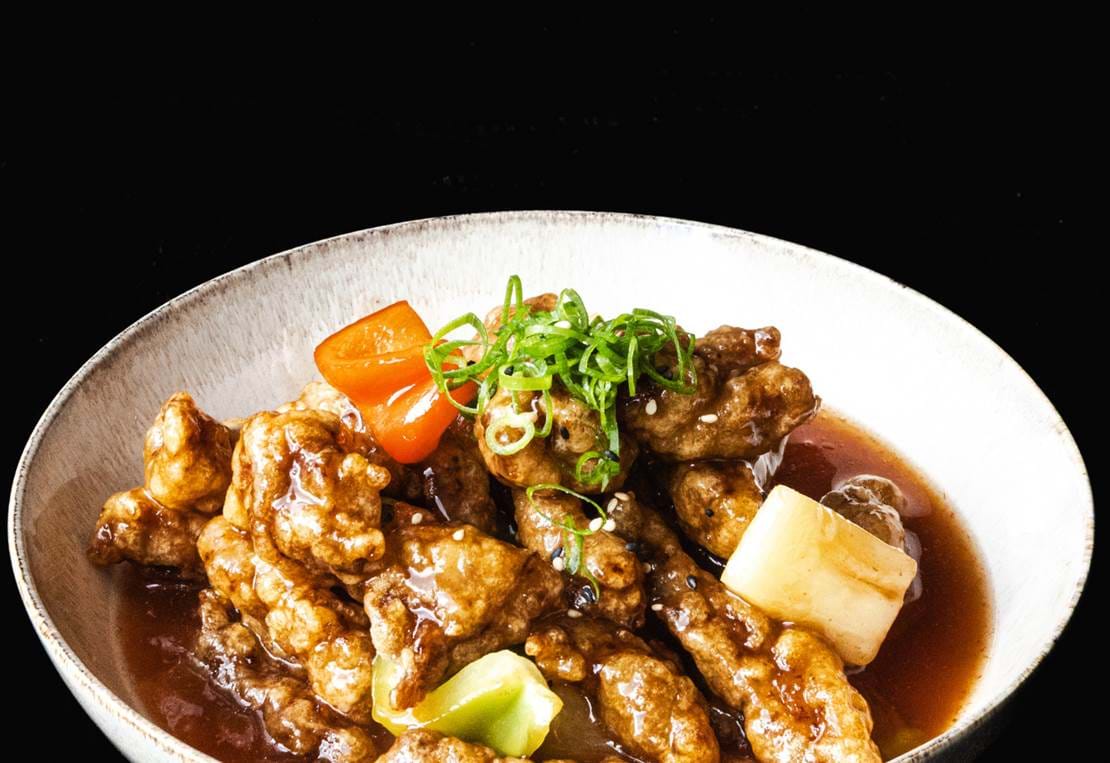 Dybstegt paneret kyllingebryst. Vælg sauce i mellem sursød, karry og teriyaki sauce.