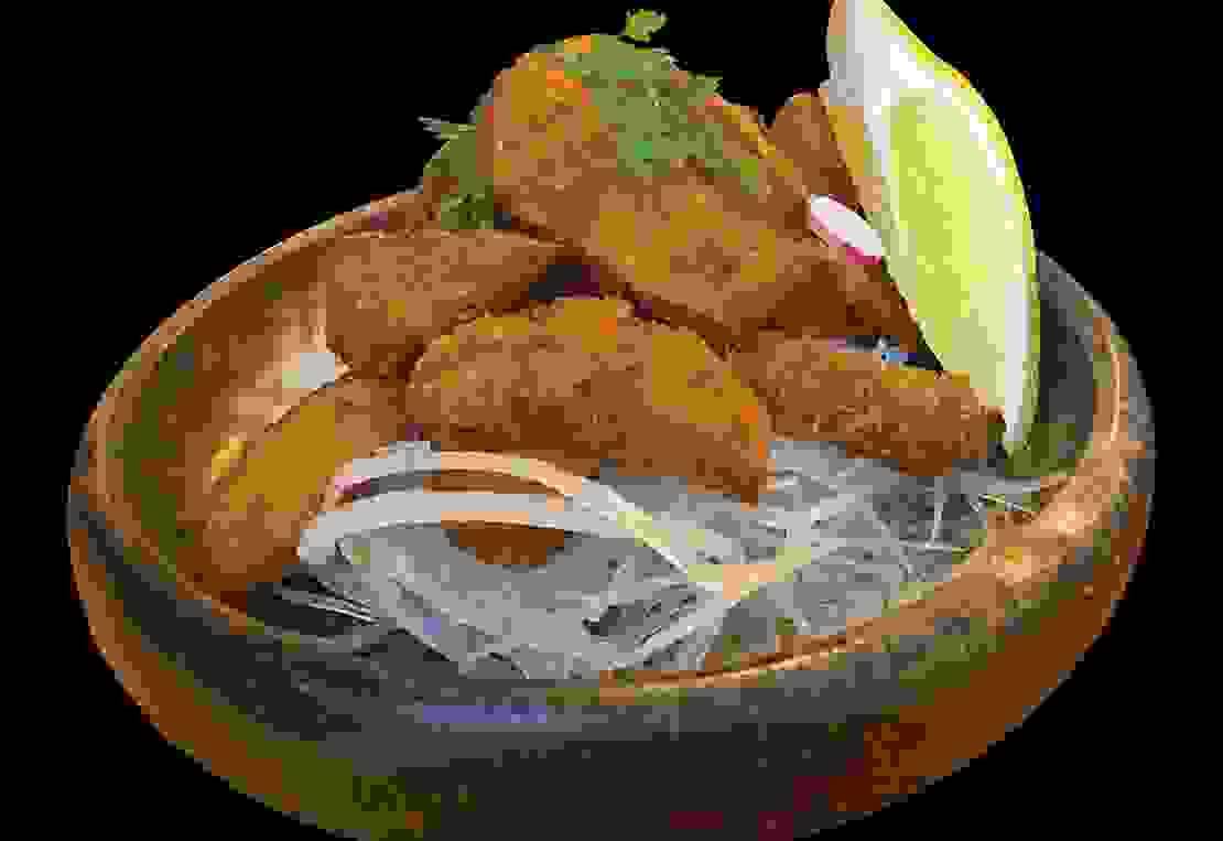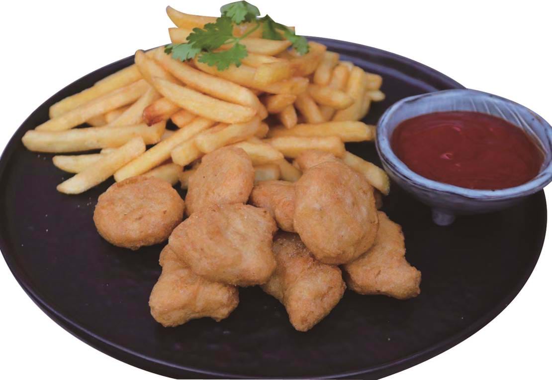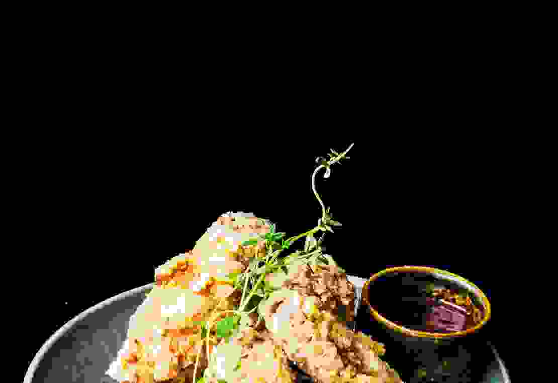 Dybtstegte små kyllingestykker serveres med chilimayo.