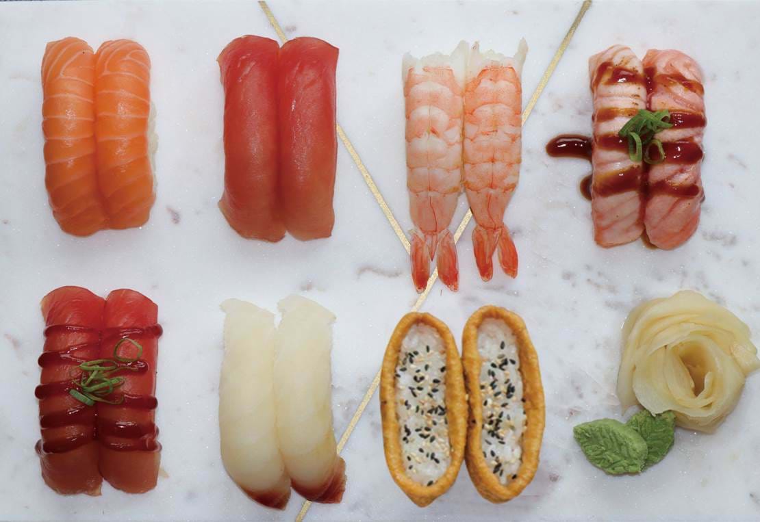 Nigiri: 2 stk Reje, 2 stk Tun, 2 stk Laks & 2 stk Grillet Laks