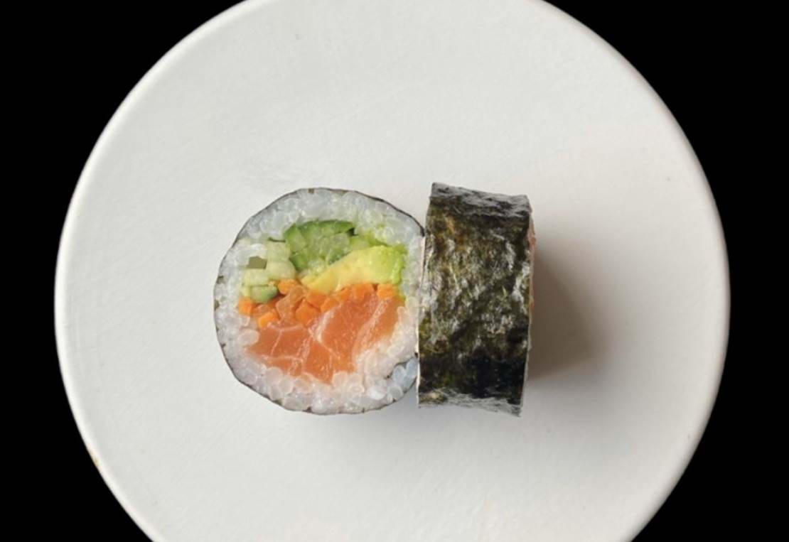 Laks, flødeost, avokado, agurk, rullet i masago.